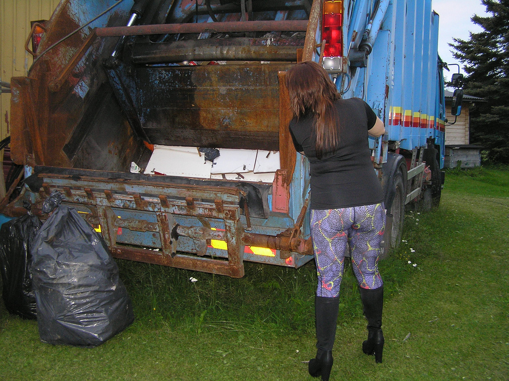 Da fällt mir eine geile Story für ein Video-Drehbuch ein: Eine übermütige Frau trampelt überdreht auf einem großen Sperrmüllhaufen herum und zertrümmert Möbel und größere Dekoteile. Die Müllabfuhr fährt heran, erwischt sie bei ihrem verrückten Treiben und die von soviel Mehrarbeit genervten Müllmänner machen ihr ein Angebot: Sie kriegt keinen Ärger, wenn sie "ihren Scheiß" selbst aufräumt