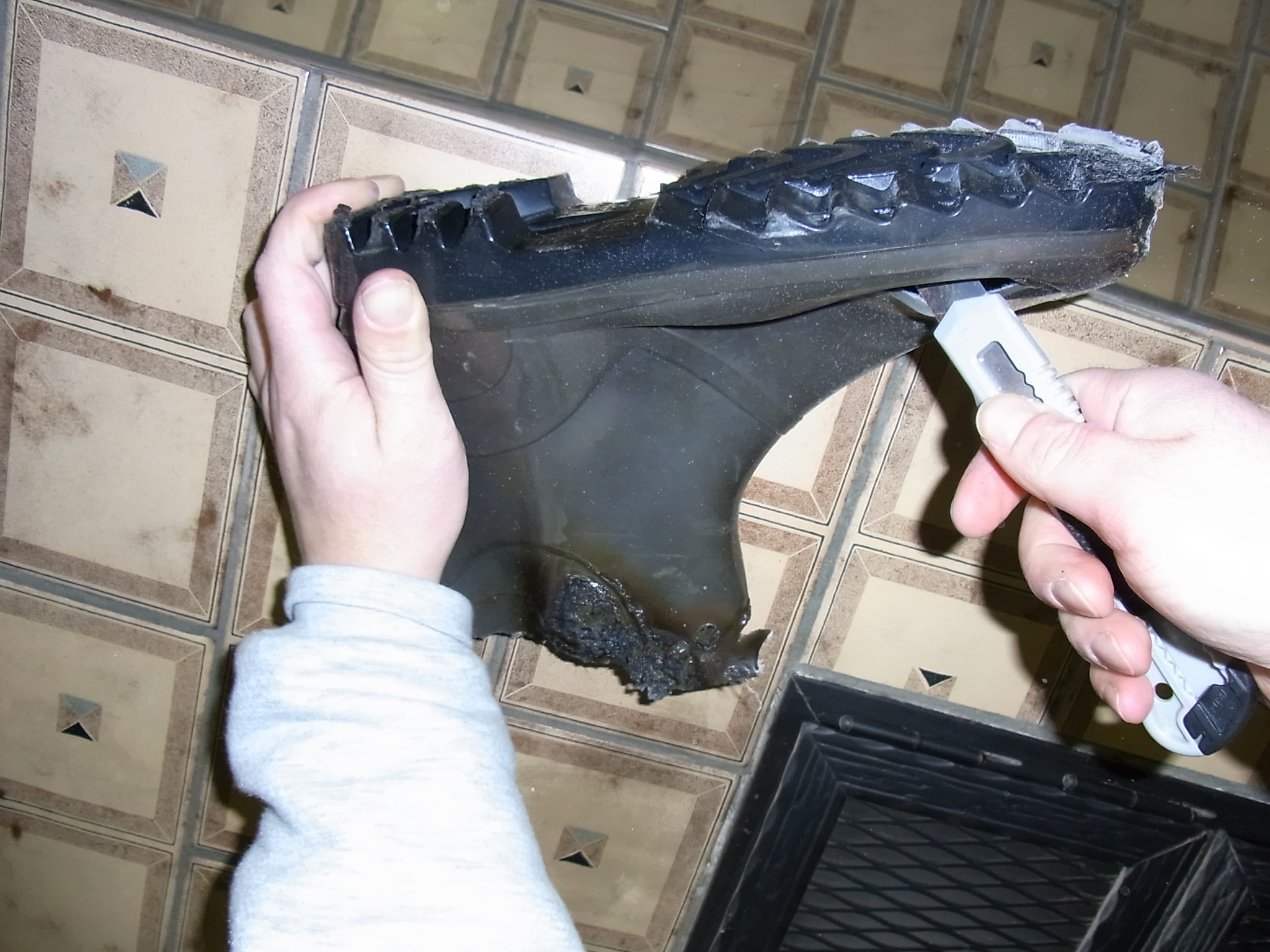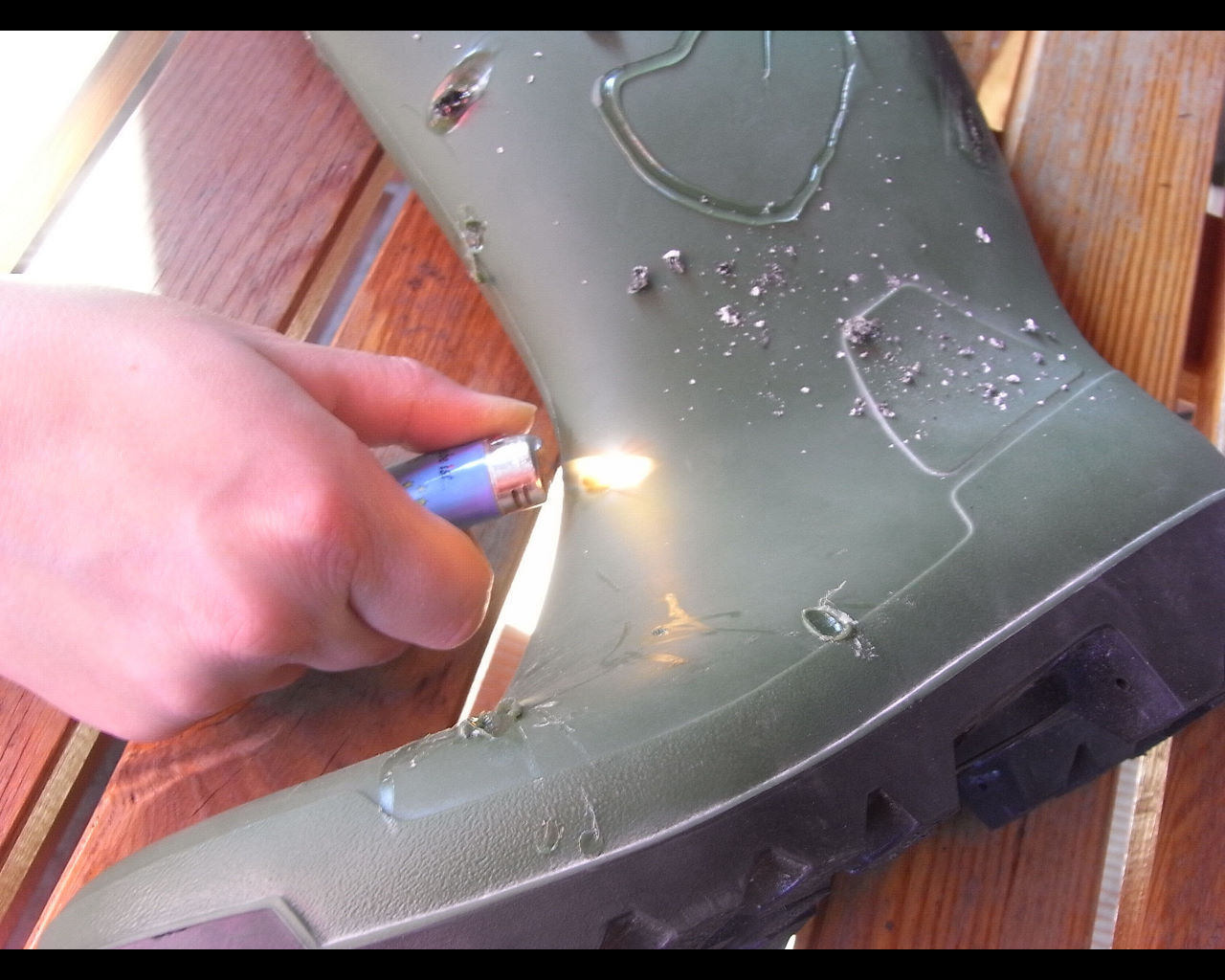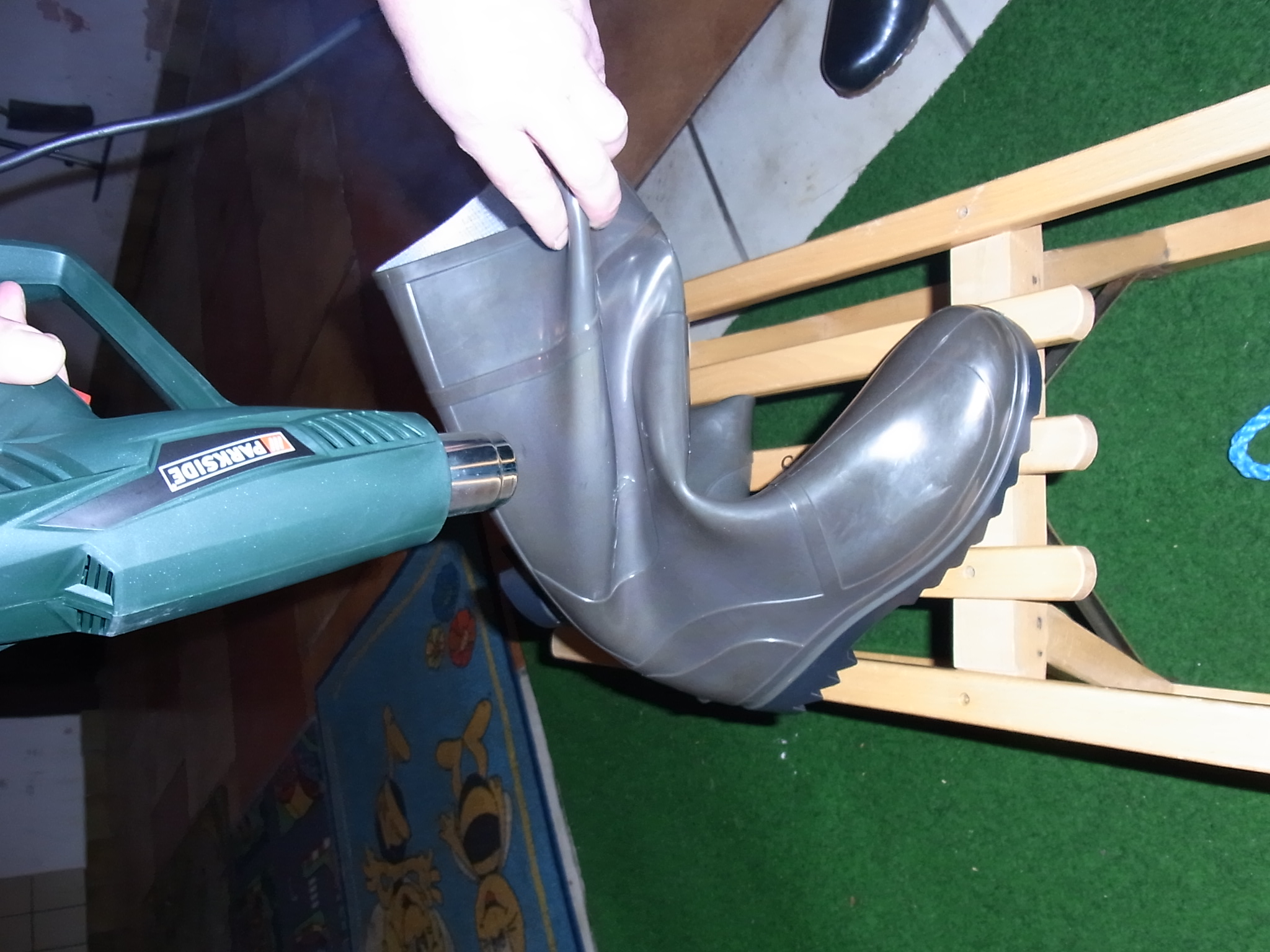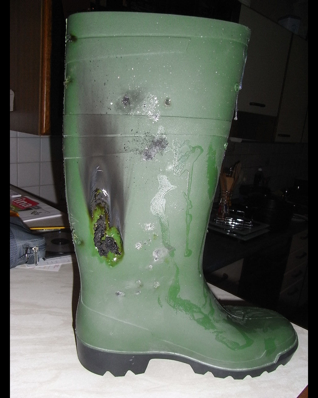 Der eine Gummistiefel wurde mit den Heißluftfön und der andere mit den Bunsenbrenner bearbeitet.