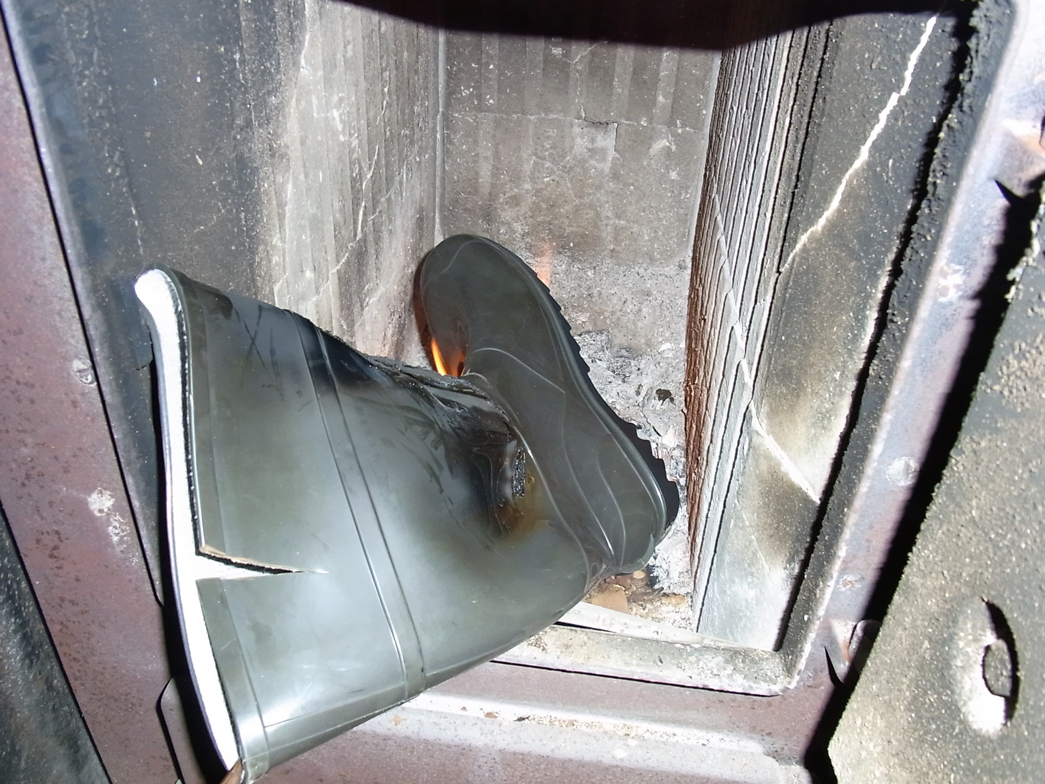 Das Verbrennen der Stiefel mußten Wir ab 3 Uhr in der nacht anfangen und um 6 Uhr waren die Gummistiefel verbrannt, der Kamin hat schön die Wärme der Stiefel aufgenommen und langsam wieder abgegeben. Zum Glück kam um 8 Uhr die Sonne so um die Ecke das Sie in die Schlafstube gescheint hat,