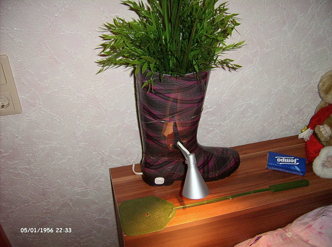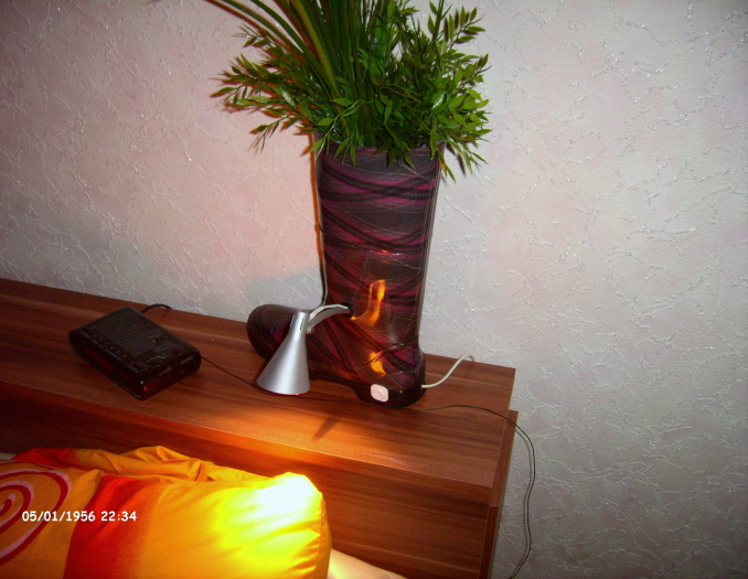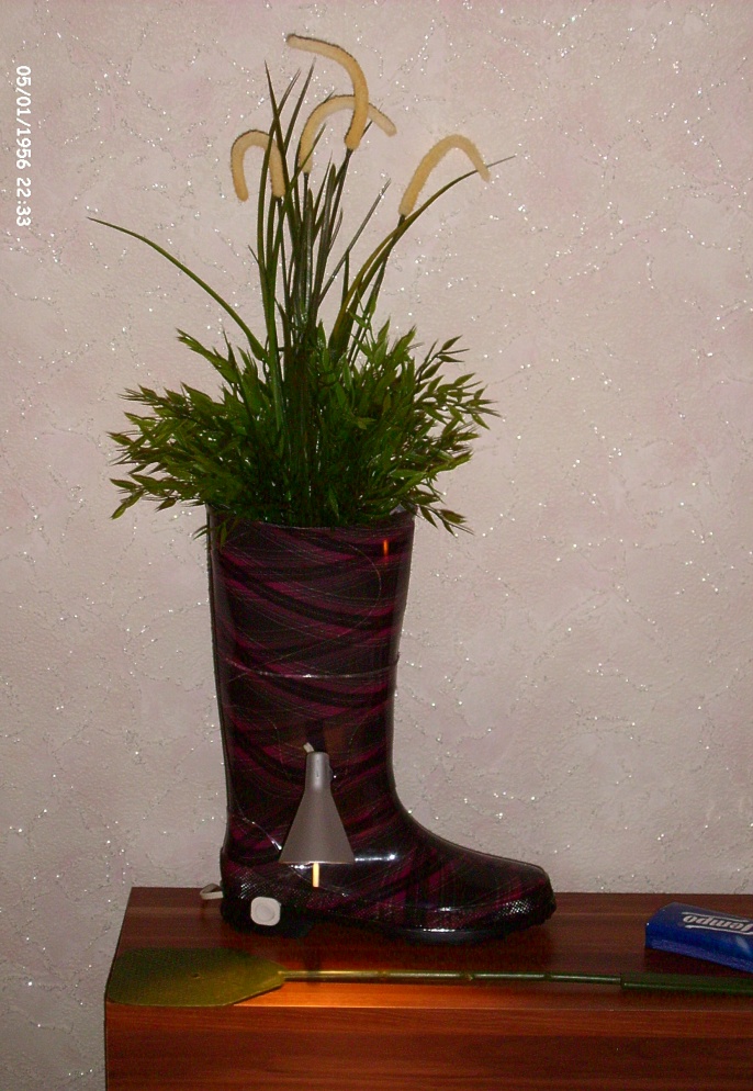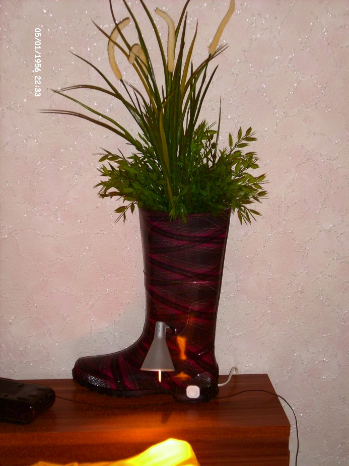 Auf dem ersten Bild ist eine Gummistiefel Umhängetasche, danach kommt ein Schreibtischstiefel und zu guter letzt noch zwei Nachttischlampen