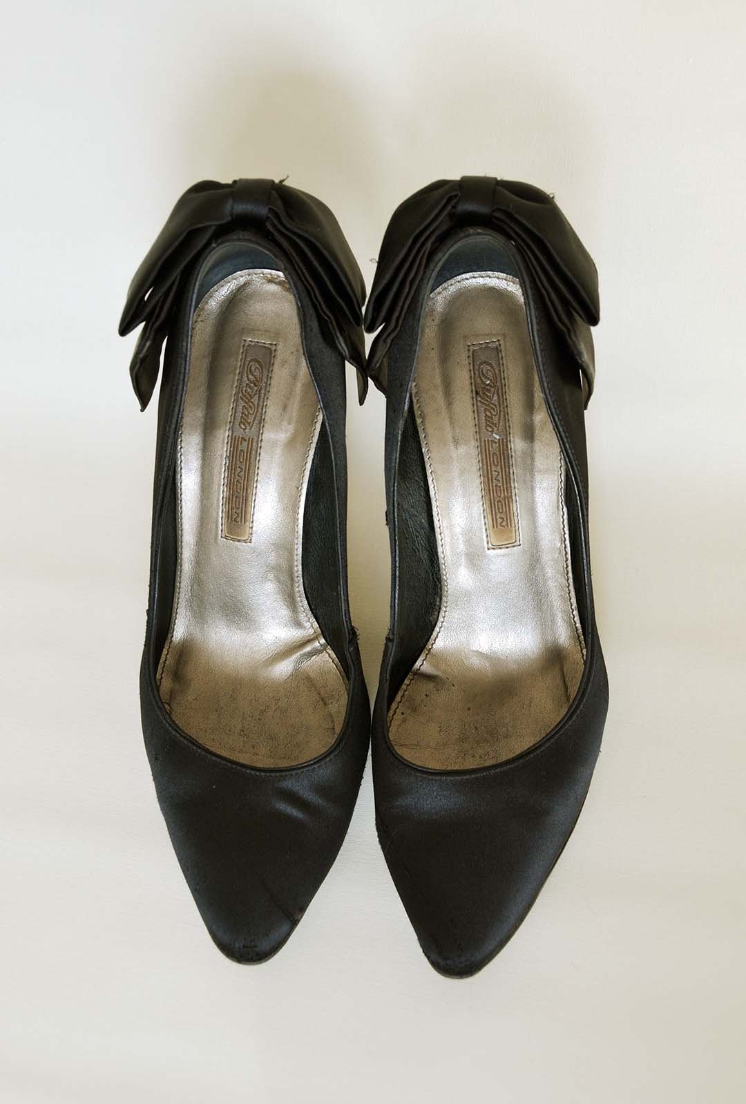 In einem zur Leerung bereitstehen Müllcontainer lagen ein Paar ziemlich fertige Satin-Buffalos. Für ein letztes Foto waren sie noch gut genug, danach Deckel wieder zu, und weiter. Als allerdings die Müllabfuhr in die Straße einbog, und nun klar war sie nur noch wenige Minuten existieren sollten, taten mir die Schuhe doch irgendwie leid. So fischte ich sie dann doch noch raus, und schaute zu wie der Container, ohne die Schuhe geleert wurde. Dabei klärte sich auch zufällig die Herkunft der Pumps. Sie stammten von einer Tanzlehrerin, die dort ein kleines Tanzstudio betreibt. Die nachträgliche rutschfeste Besohlung der Schuhe war ein eindeutiger Hinweis auf diese Verwendung. Der Niedergang der Schuhe, vom edlen Tanzschuh zum Übungsschuh, und letztlich zu Müll, hätte mit der Vernichtung eigendlich sein Ende gefunden. Gereinigt und desinfiziert sehen die Pumps eigentlich noch ganz akzeptabel aus. Obwohl sich solche Schuhe im offenen Kamin sehr schön verbrennen lassen, bleibt es ihnen definitiv erspart, sie werden einfach nur weiter vor sich hin existieren.