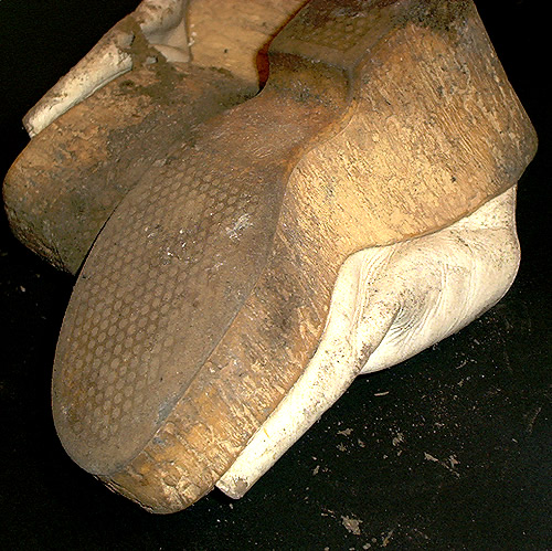 Will man solche halb verdauten Schuhe wieder alltagstauglich machen, so muss man die Brandsohlen mit Hilfe von Epoxy Harz rekonstruieren und möglichst die Gelenkfedern ersetzen.