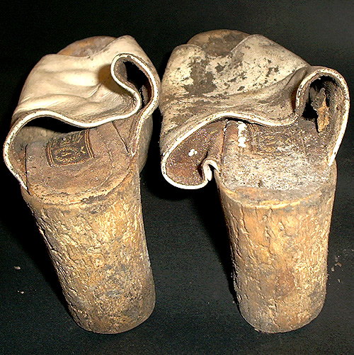 Die Stilettos aus dem Sumpf sind nach gründlichem Austrocknen der Brandsohlen leidlich stabil. Deutlich kann man an den Schuhen jedoch erkennen, dass die Brandsohlen gut 50% dicker geworden sind, was bedeutet, dass der Zersetzungsprozess und die Vertorfung bereits unbramherzig von den Schuhen Besitz ergriffen haben. Auch zeigen rostrote Verfärbungen, dass die Gelenkfedern bereits die typischen Eisenoxid Verkrustungen aufweisen. in Diesem Stadium sind die Brandsohlen in der Regel bereits von Kleinorganismen (Friede ihrer Seele