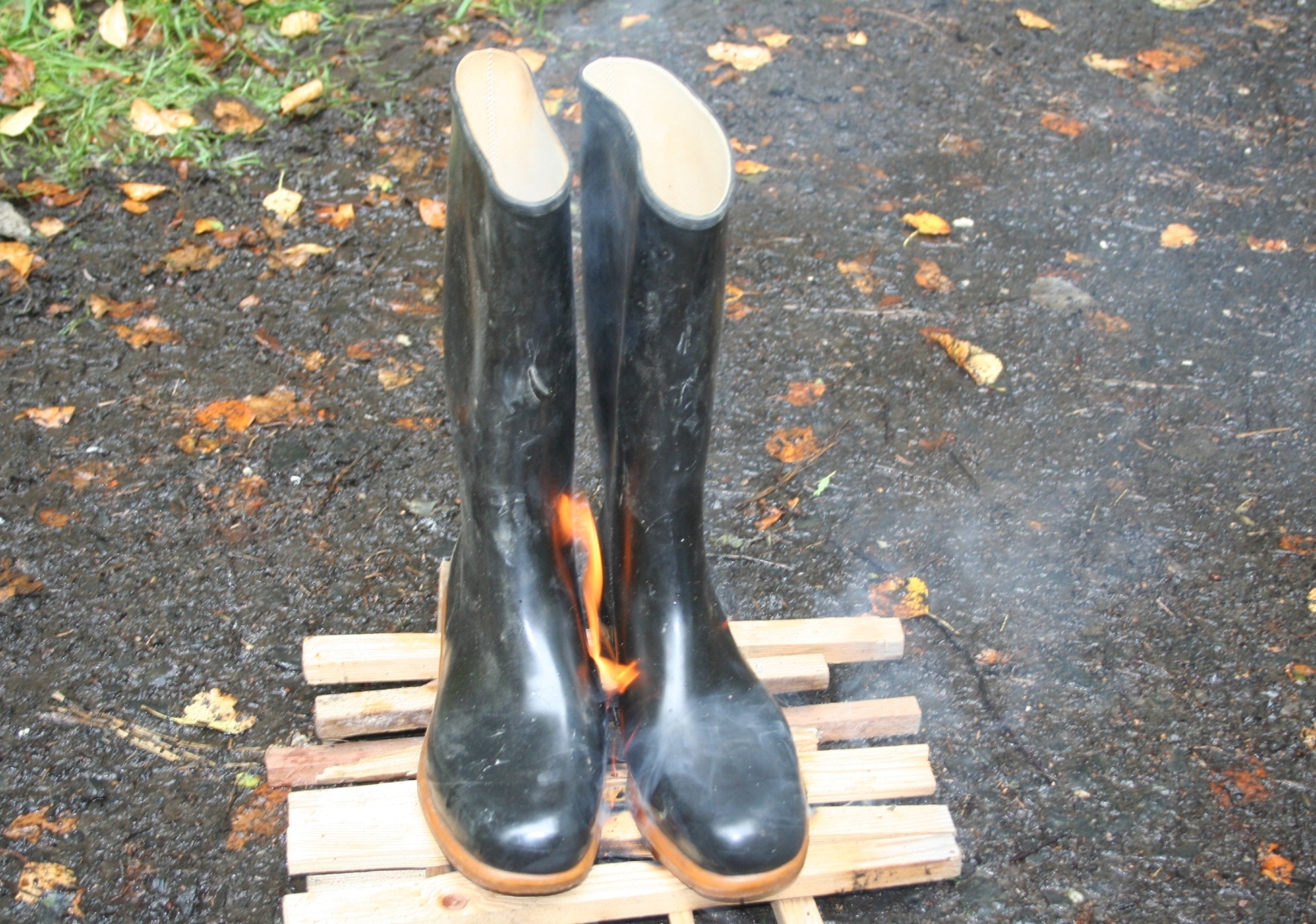 Diese Gummistiefel aus richtigem Gummi waren mit den Jahren hart geworden, deshalb nicht mehr gut zu benutzen. Die Verhärtung hatte aber die Folge, das beim verbrennen die Stiefelschäfte nicht einknickten und hochlodernde Flammen ermöglichten.