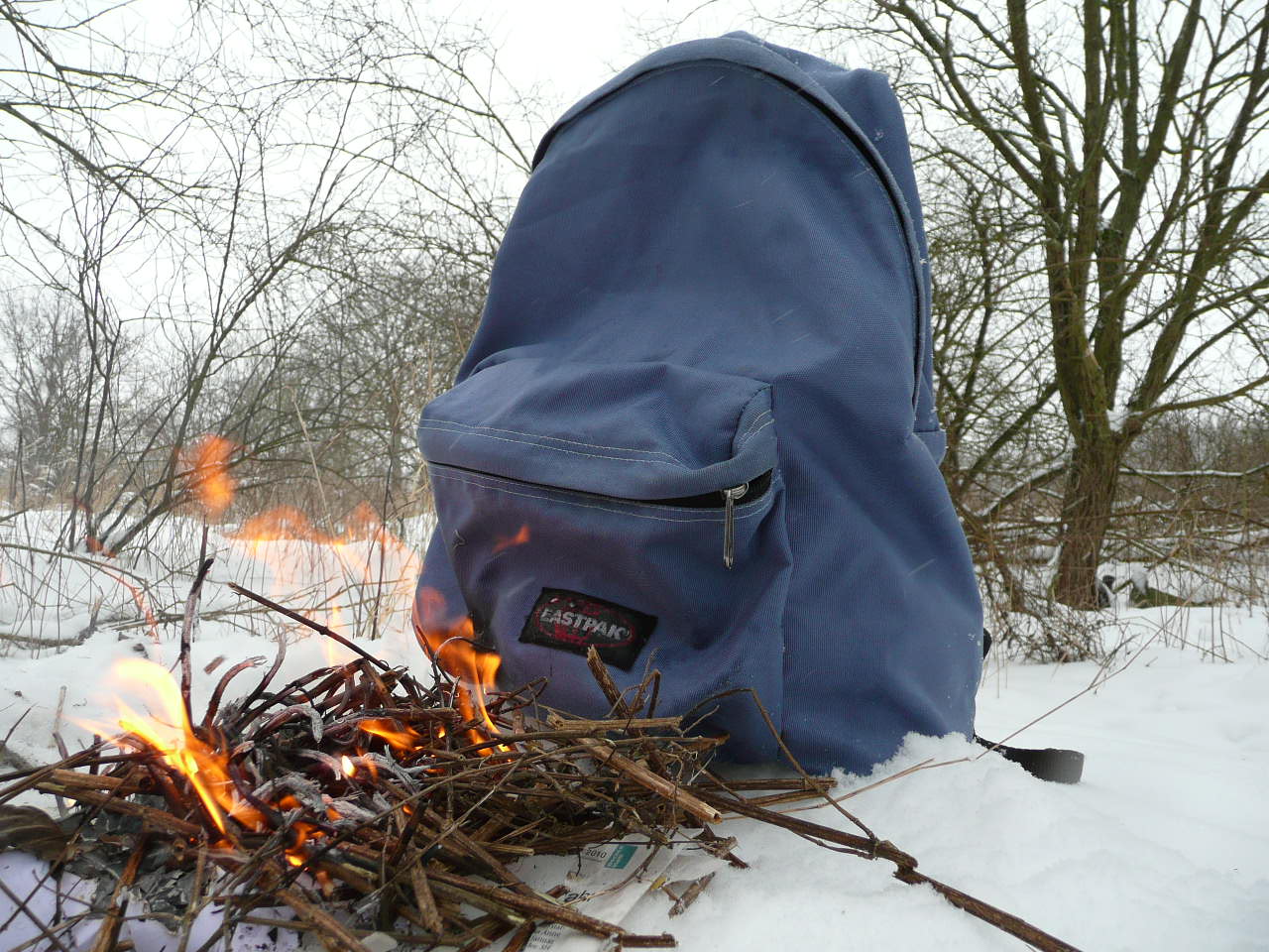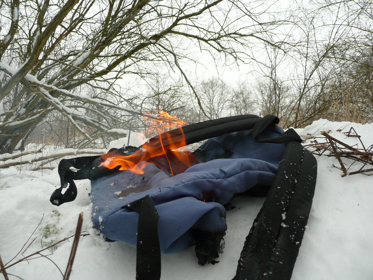 Aber wenn du die brennenden Reste rechtzeitig zusammen geschoben hast, dann ist sicherlich fast alles in Rauch aufgegangen. Geradezu witzig sieht das vorletzte Bild aus. Man könnte meinen, du hast versucht, glühende Kohlen mit dem Rucksack zu transportieren.