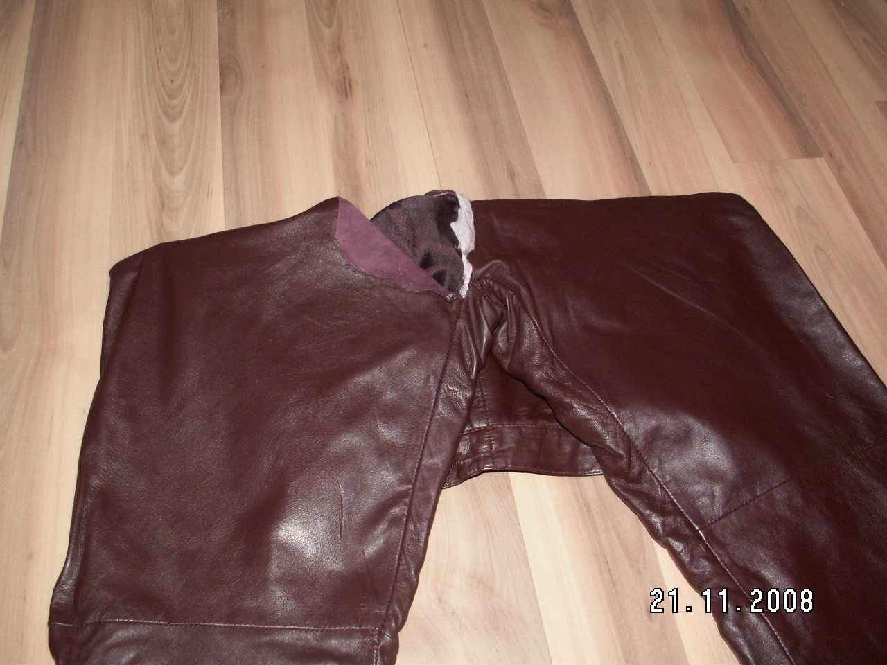 also entweder ist am Hintern das Leder aufgerissen, oder die Lederhose wurde ausrangiert und vorne der Reißverschluss rausgeschnitten und die Hose vor ihrer Vermüllung ausgeschlachtet