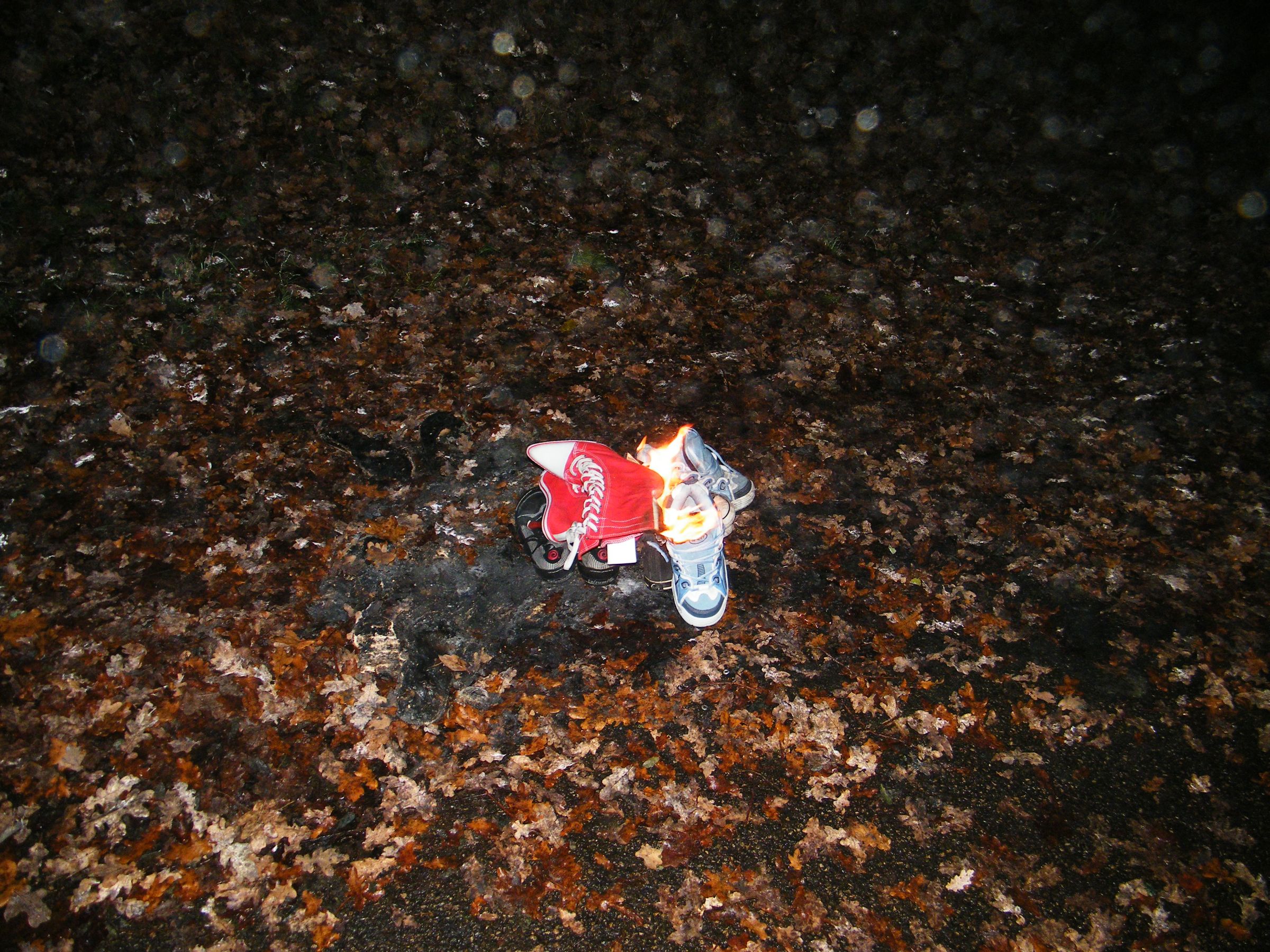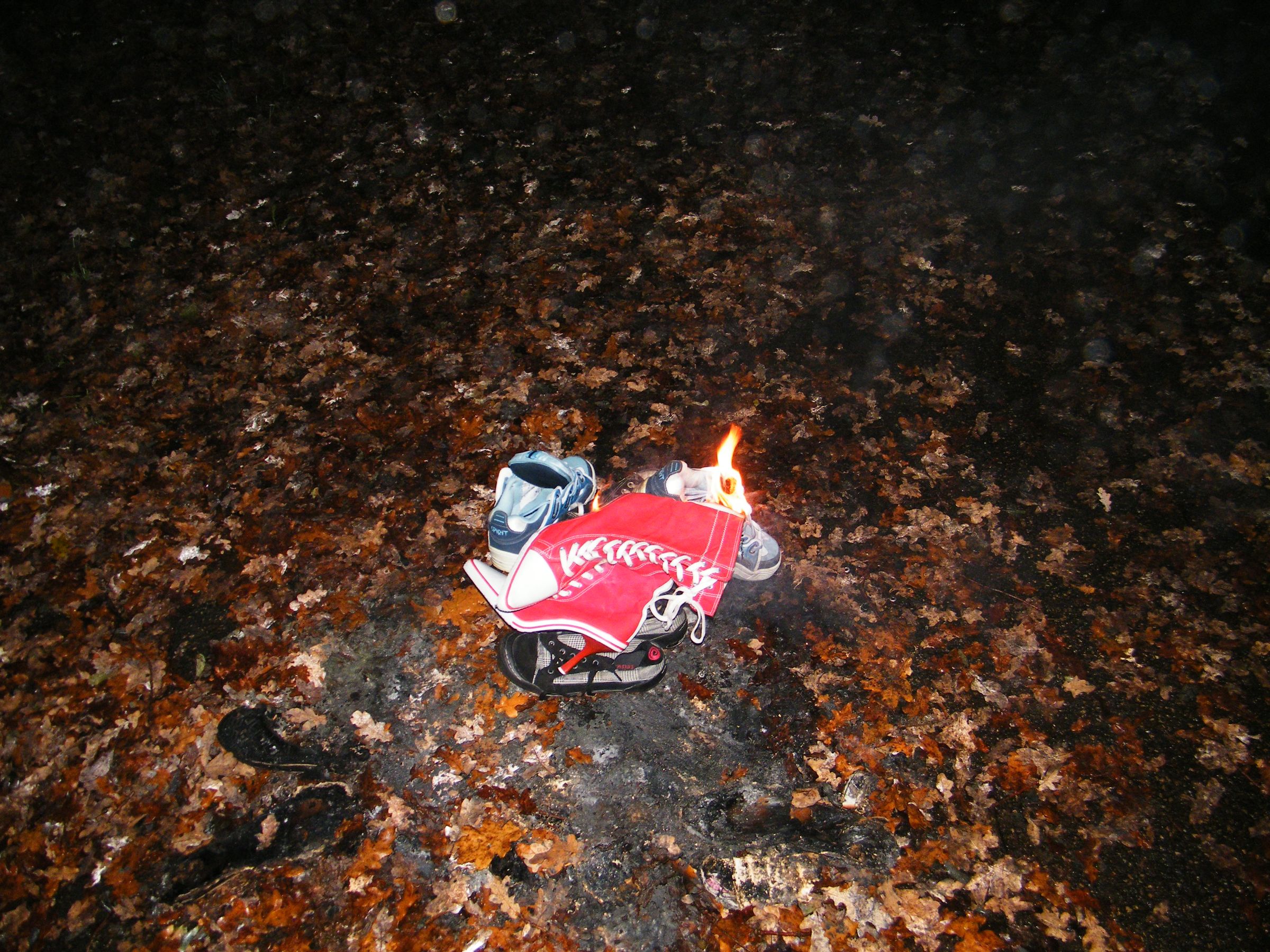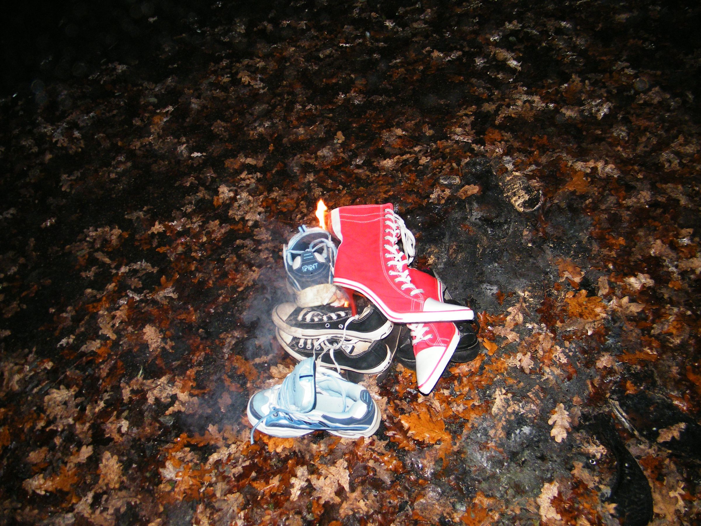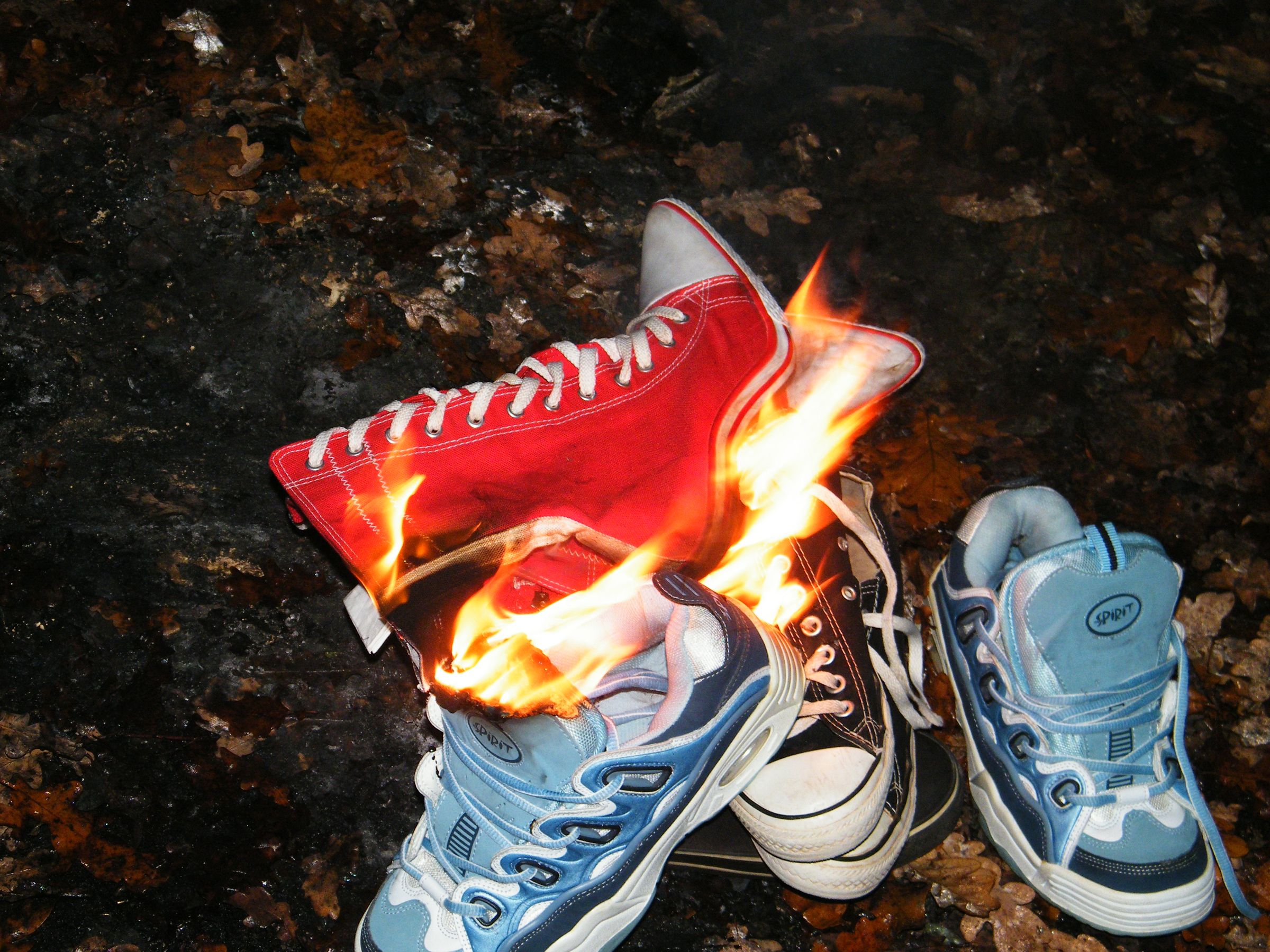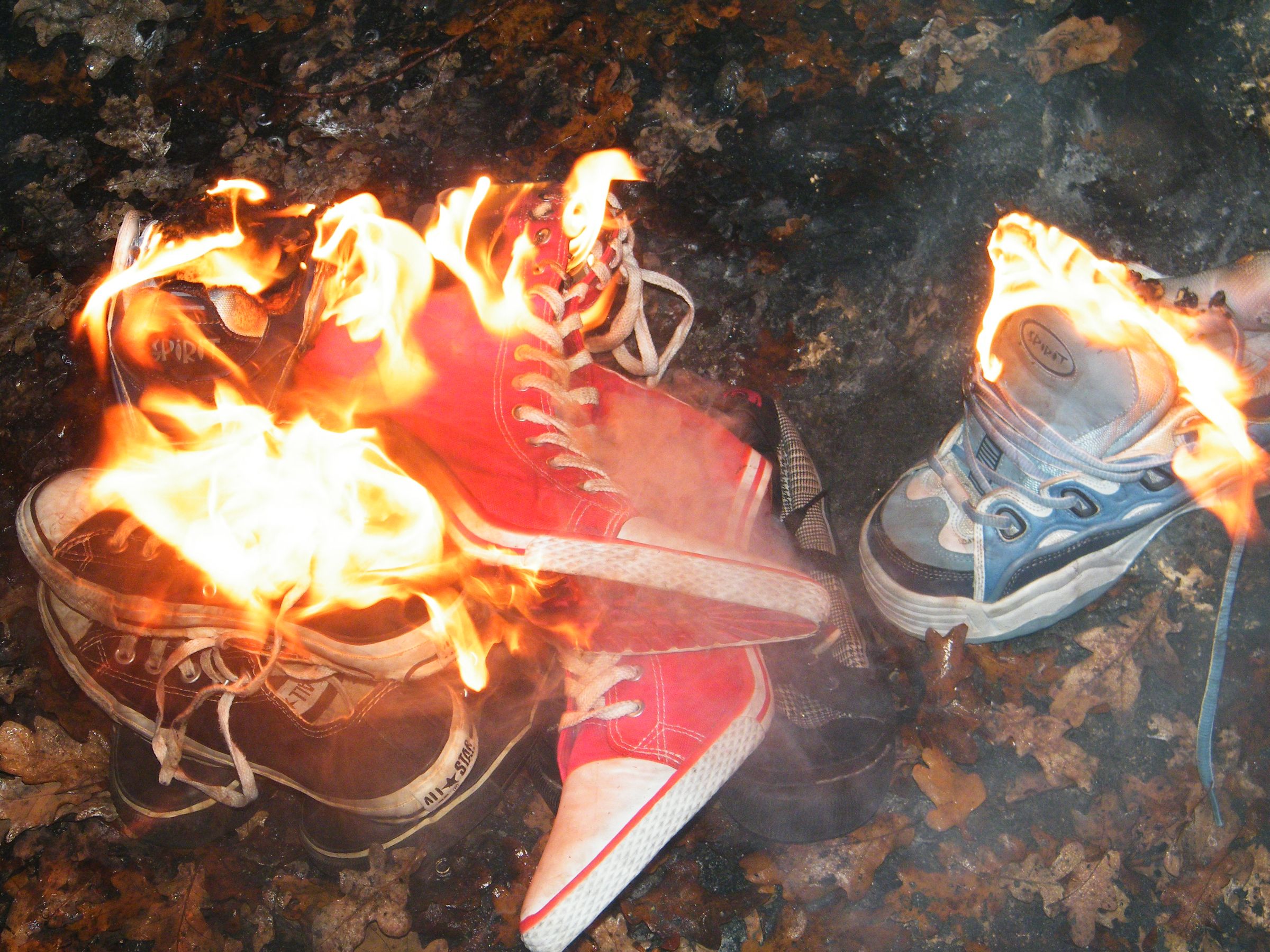 Daraus gelernt, fand' der nächste Videodreh - und alle, die noch folgen sollten - im heimischen Badezimmer aufgrund der vorhandenen (Rauch-)Abzugsanlage (fragt nicht, wofür die da ist!) statt. Ich frage mich, warum ich da nicht gleich drauf gekommen bin. Aber ich sollte lernen, dass Adidas' Superstars zum einen ungern brennen wollen und zum anderen, wenn sie denn mal aus eigener Kraft Feuer gefangen haben, fürchterliche Gerüche absondern. Inzwischen verwendet man zwar Brandbeschleuniger und andere Utensilien, weil man daraus gelernt hat, doch muss ich zugeben: Die Superstars waren nicht die schlimmsten Fußbekleidungsstücke in dieser Hinsicht!