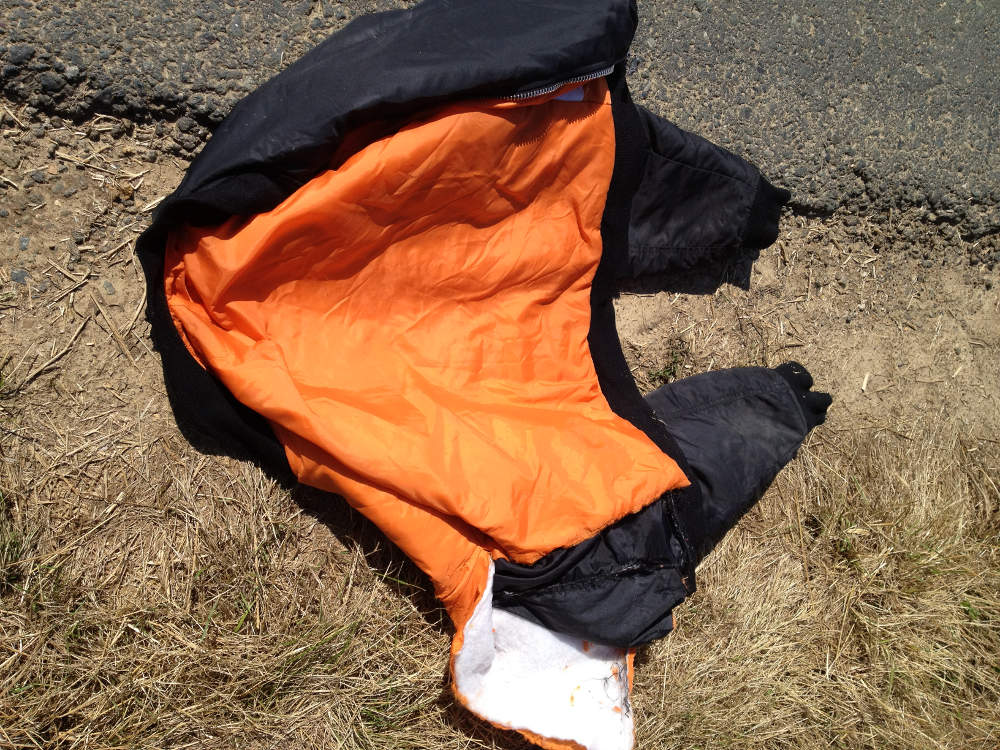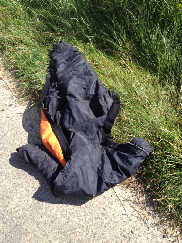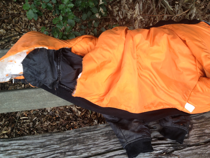 Mülltonne? Da geht doch noch mehr kaputt zu machen. Die Ärmel sind noch dran und der Innenstoff auch noch teilweise. Das kann alles noch weg
