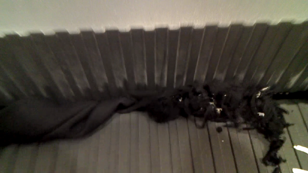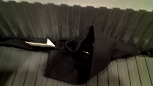 Verschrottung von Röckchen 6 und 7, wie erwähnt in Längs- und Querrichtung. Wie vemutet, geben die Eingrifftaschen, wo der Lack doppelt ist dem Shredder zu schaffen. In Querrichtung einlagig geht es aber noch schlechter, da der Shredder den Jerseystoff nicht zu lieben scheint. Der relativ dicke elastische Bund ist wohl auch nicht allzu leichte Kost (ist schliesslich dicker Jeseystoff und eine bis zwei Lagen - je nach Stelle - Lackstoff hineingenäht). Ganz abgesehen davon "wurstelt" es ziemlich, da der Rock höher ist als der Shredder breit ist. Wie man auf der Homepage von H&M sehen kann, handelt es sich schliesslich nicht um einen Minirock, sondern ein elegantes knielanges Modell. Wenn man die XS in Längsrichtung durchlässt, passt es hingegen sehr gut, bis zummoment wo die Taschen drankommen. Auch haben die Röckchen die Eigenschaft, gegen Schluss nicht mehr ganz so flach durchlaufen zu wollen. Als wollten sie sich bis zum bitteren Ende wehren. Vielleicht bringt es etwas, einmal einen Versuch "kopfvoran" durchzuführen und bei der zähen Taille sowie den Taschen etwas die Kinetische Energie der rotierenden Messer auszunutzen.