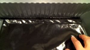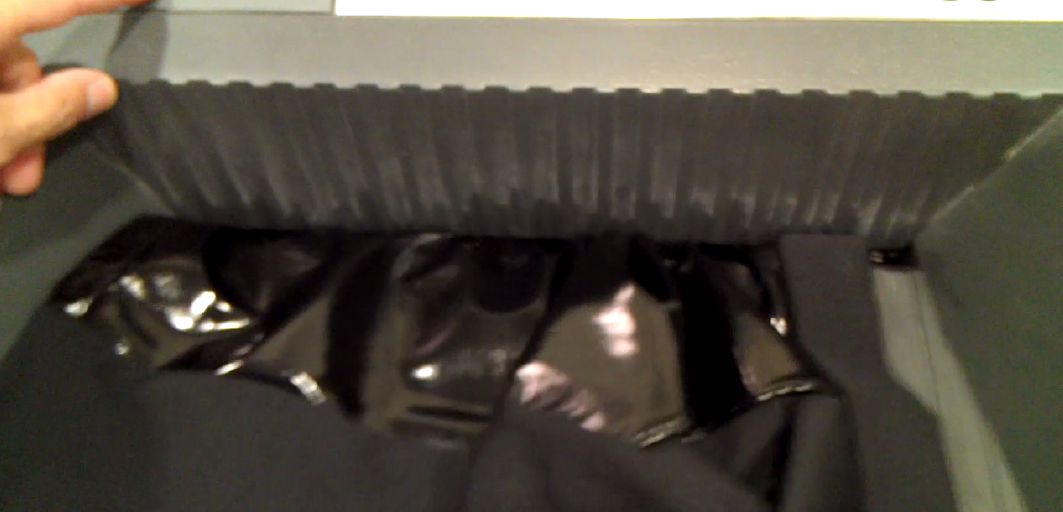 Die Röckchen haben oben Eingrifftaschen, welche recht elegant aussehen aber dem Shredder zu Beissen geben. Der matte Teil, den man bei der Draufsicht von auf die Taschen von vorne sieht, ist der gleiche Lackstoff wie er für die Front verarbeitet wurde, nur einfach "von Links" verarbeitet. Dieses Detail wird wohl diese drei Gründe haben: 1.) Sieht der Stoff auch von Links gut aus, 2.) will man einen Kontrast erreichen (d.h. die sich nach oben etwas verjüngende Lackfront sieht so doch sehr elegant aus) und 3.) hat der Stoff der Taschen die gleichen Dehnungseigenschaften wie die Front, was zu vermindertem Aufklafen der Taschen beim Bewegen führt. Also ein ästhetisch und funktionell durchaus durchdachtes Detail, welches aber dem Shredder Mühe bereiten kann. Der untere Saum der Lackfront ist auch etwas breit und könnte ebenfalls zu Beissen geben.