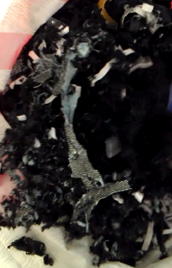 Shreddern der Lackblazers. Dieser macht sehr viel her. Leider war hier die Kameraführung hundmiserabel. Aber der sehr feine, weiche, elastische und hochglänzende Lackstoff (wie er bei guten Dessous, Kleidern, Jeans, Leggings etc verwendet wird) macht sehr viel her. Und zwar sowohl optisch wie auch akustisch. Keines des anderen Teile hat bis jetzt so schön geraschelt und gequietscht bei der Verschrottung. Wobei ich mich dafür entschuldigen muss, dass der Shredder etwas laut ist und die feinen akustischen Details meistens etwas untergehen. Wie vermutet, machten das Revers und die Schulterposter dem armen Shredder etwas Mühe. Die Maschine blockierte öfters und musste dann angehalten und etwas rückwärts laufen gelassen werden oder das Opfer musste von Hand wieder etwas herausgerissen werden, bevor es weiterging (ist bei den anderen Teilen z.t auch so). Der Futterstoff schien aber kein Problem zu stellen. Zuerst regte ich mich auf, dass es nicht glatter durchlief. Aber im Nachhinein muss ich sagen, dass es auf diese Weise irgendwie noch etwas brutaler aussieht.