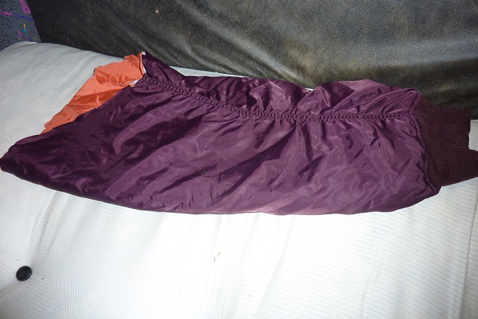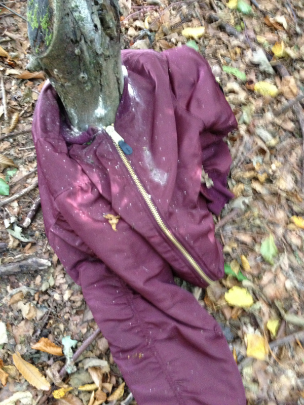 Hab die beiden Jacken vor einem Vierteljahr in den Wald gebracht damit sie dort langsam zerfallen. Die rote ist um einen Baum festgemacht.Auf dem Baum sitzen scheinbar Vögel die das geile ding ständig vollsch....