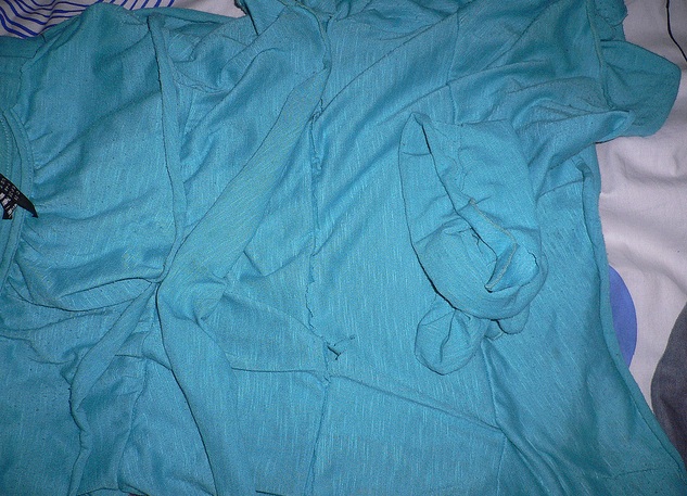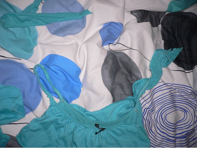 Bei einem blauen habe ich mit der Schere angefangen, die Volants der Reihe nach abzuschneiden. Auch die Träger haben schon gelitten. Danach kam dieses und das rosane Spitzentop dran. Ich wollte Indoor Paintball zocken