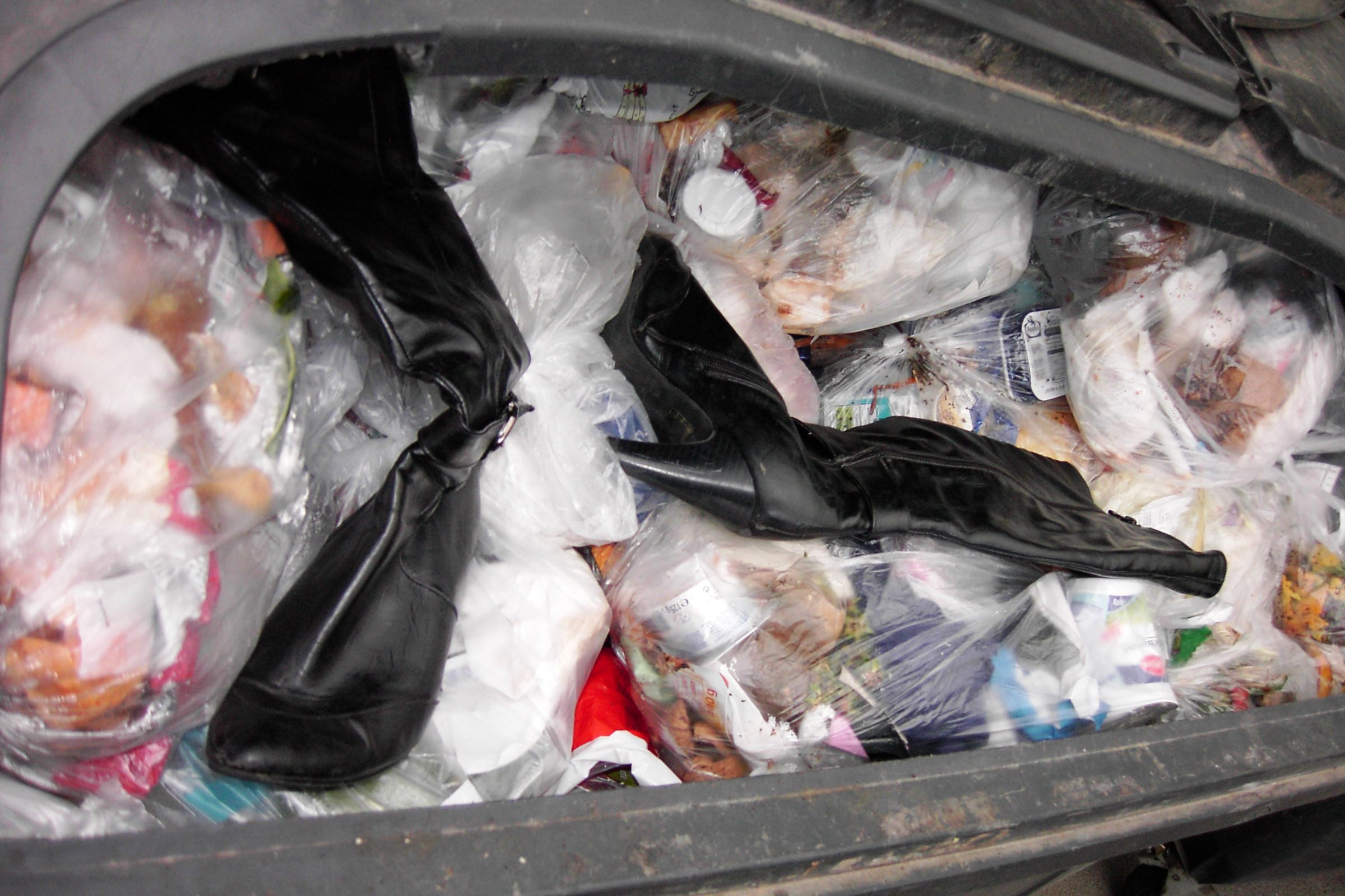 Der von der Frau reingestopfte Küchenmüllbeutel rutschte auf einmal auf den Stiefel.