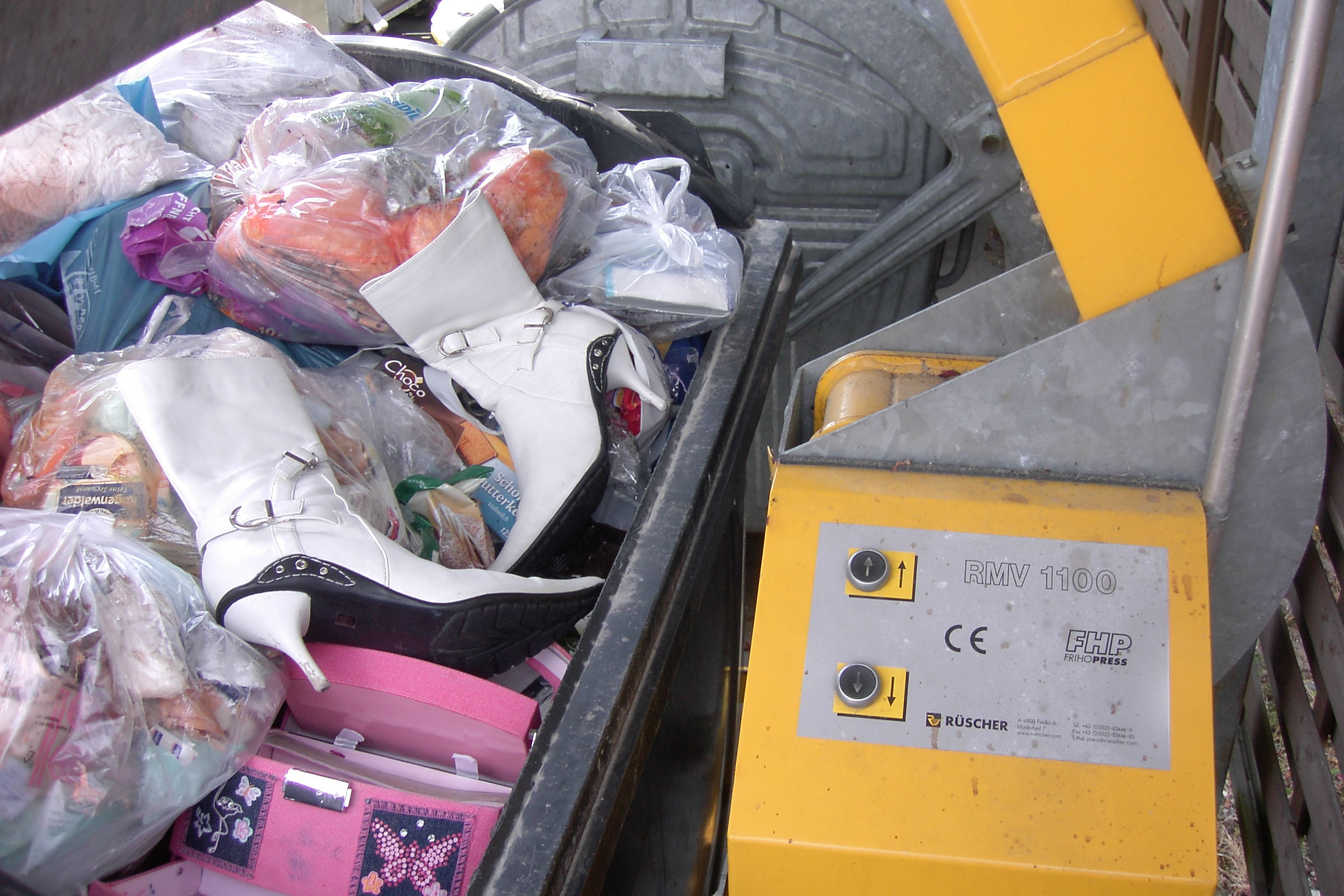 Das hatten sich die Stiefel und die neue Eigentümerin auch anders vorgestellt: Statt Tanzfläche und Kerle anmachen nun ein stinkender Müllcontainer und eine Presse, die nur noch platt macht!