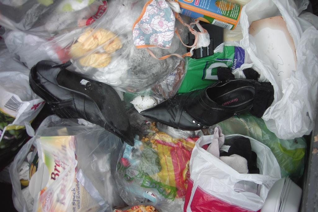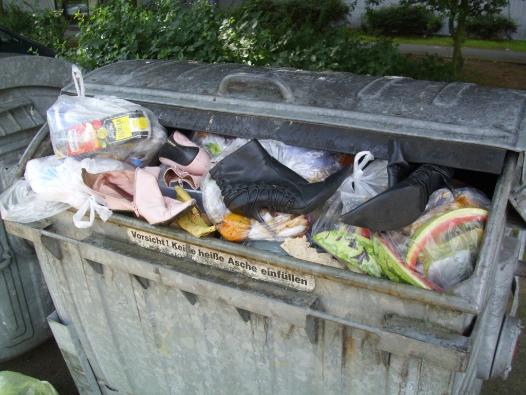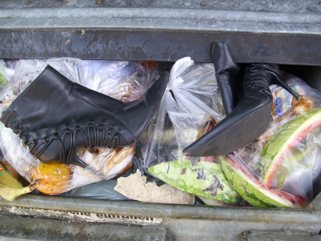 Jetzt kam für mich der Hammer und ich musste mich echt beherrschen, nicht meine Gesichtszüge entgleiten zu lassen: Sie sagte, dass sie glücklicherweise den Hausmeister kenne und den würde sie jetzt bitten herunter zu kommen und den oben liegenden Dreck samt Stiefeln tief in den Müllcontainer zu pressen, damit sie endlich „aus der Welt“ seien. Mein fragendes Gesicht motivierte sie, mir auch gleich dafür die Erklärung zu geben. Leider verlor sie damit meine ganze Sympathie: