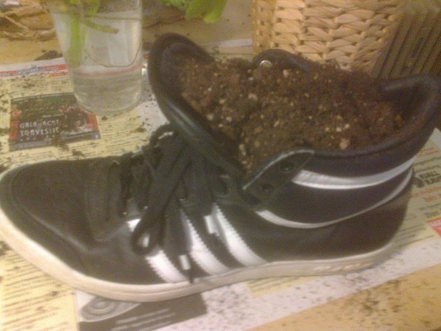 Ich hab mal so nachgedacht und mir ist aufgefallen, dass sich Schuhe eigentlich perfekt zum topfen eignen. Das Gießwasser setzt sich langsam im Textilmaterial fest und wenn sich die Latschen zersetzen ist es Zeit zum umtopfen.