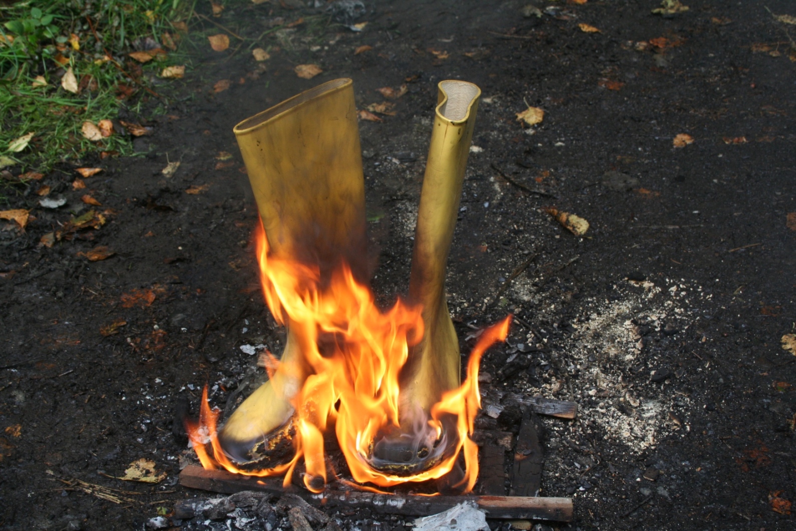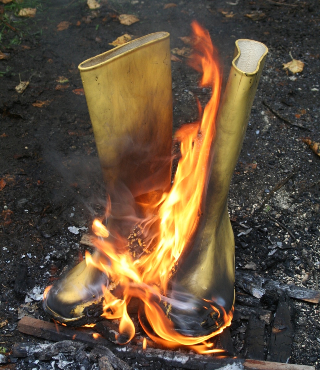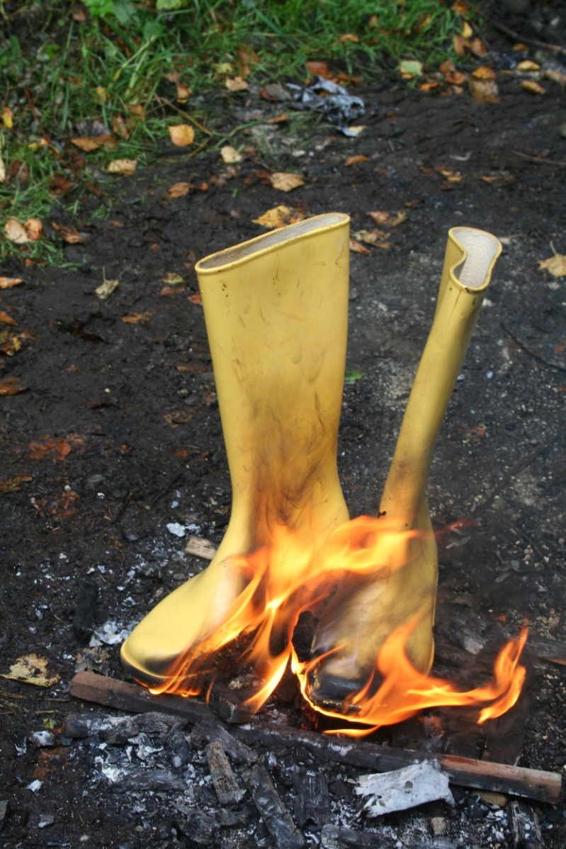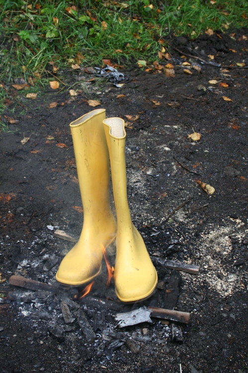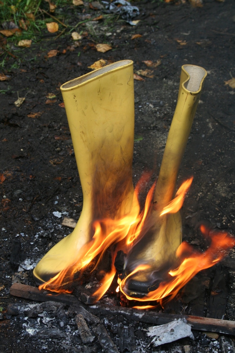 Irgendwann war es dann soweit, die gelben Romika Damengummistiefel mußten brennen. Deutlich ist zu sehen, wie die erst noch recht sauberen Gummistiefel vom eigenen Rauch, der beim verbrennen dieser PVC Stiefel entsteht, am Schaft schwarz verfärbt werden.