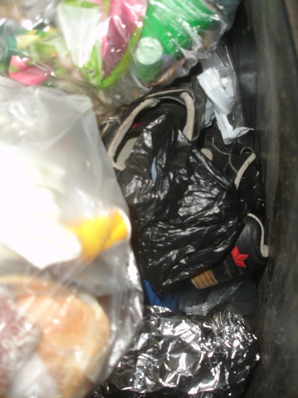 Zurück zu den größeren Restmülltonnen: Eine Tüte voller Joggingschuhe und einem Paar Sandalen.