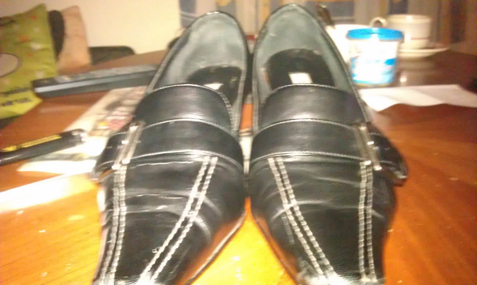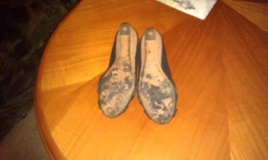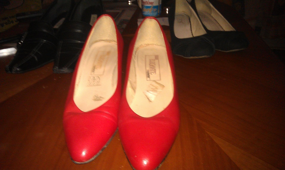 Die Absätze sind runter und die Sohlen sind auch schon dünn. Wer wollte diese Arbeit wohl noch in die Latschen stecken?? In der übernächsten Woche wird die Feuertonne wieder brennen und dann kommen sie endgültig weg.