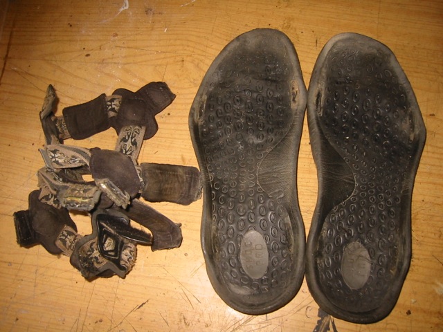 Heute habe ich versucht, aus abgelatschten Teva Sandalen, Gummipuffer für meinen Kompressor zu schneiden. Die Sohlen der Tevas scheinen mir dick genug, um die Vibrationen des Kompressors zu Dämpfen.