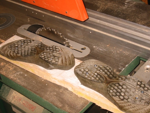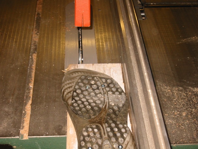 Weil das ganze auch ein bisschen profimässig aussehen sollte und die Stücke rechteckig und nicht irgendwie aussehen sollten, habe ich versucht, die Sohlen auf der Kreissäge zu schneiden.