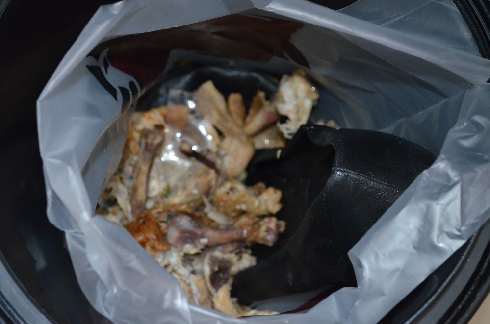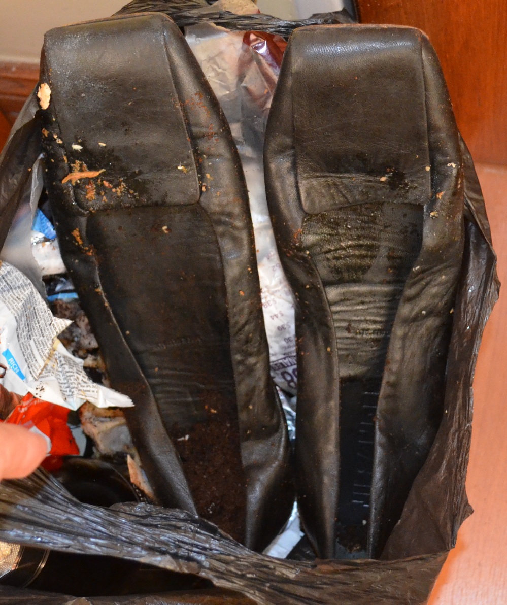 Nur einen Tag durften die feinen Schuhe so unbefleckt im Müll ruhen, dann gab es Hühnchen zum Abendessen - und die Reste landeten natürlich auch im Müll. Die fettigen Abfälle schmiegten sich an das zarte Leder. Ich will mir nicht vorstellen wie sich die zersplitterten Hühnerknochen sich dann im Müllauto in das weiche Leder drücken . . .