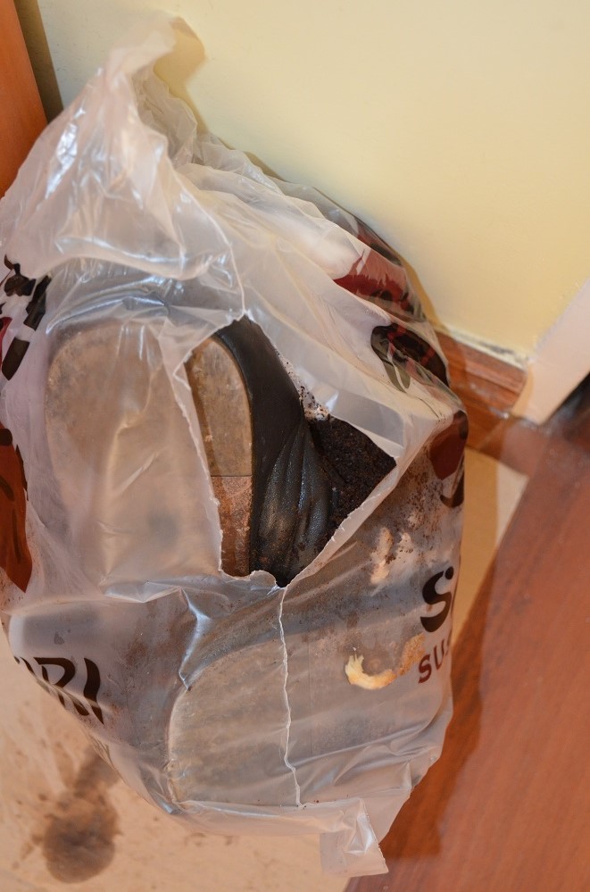 Bevor sich unsere Putzfrau erbarmte und die Tüte in den Hausflur stellte durften die weichen Schuhe nochmals ihre ganze, nun total versaute Schönheit zeigen.