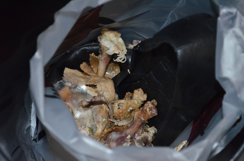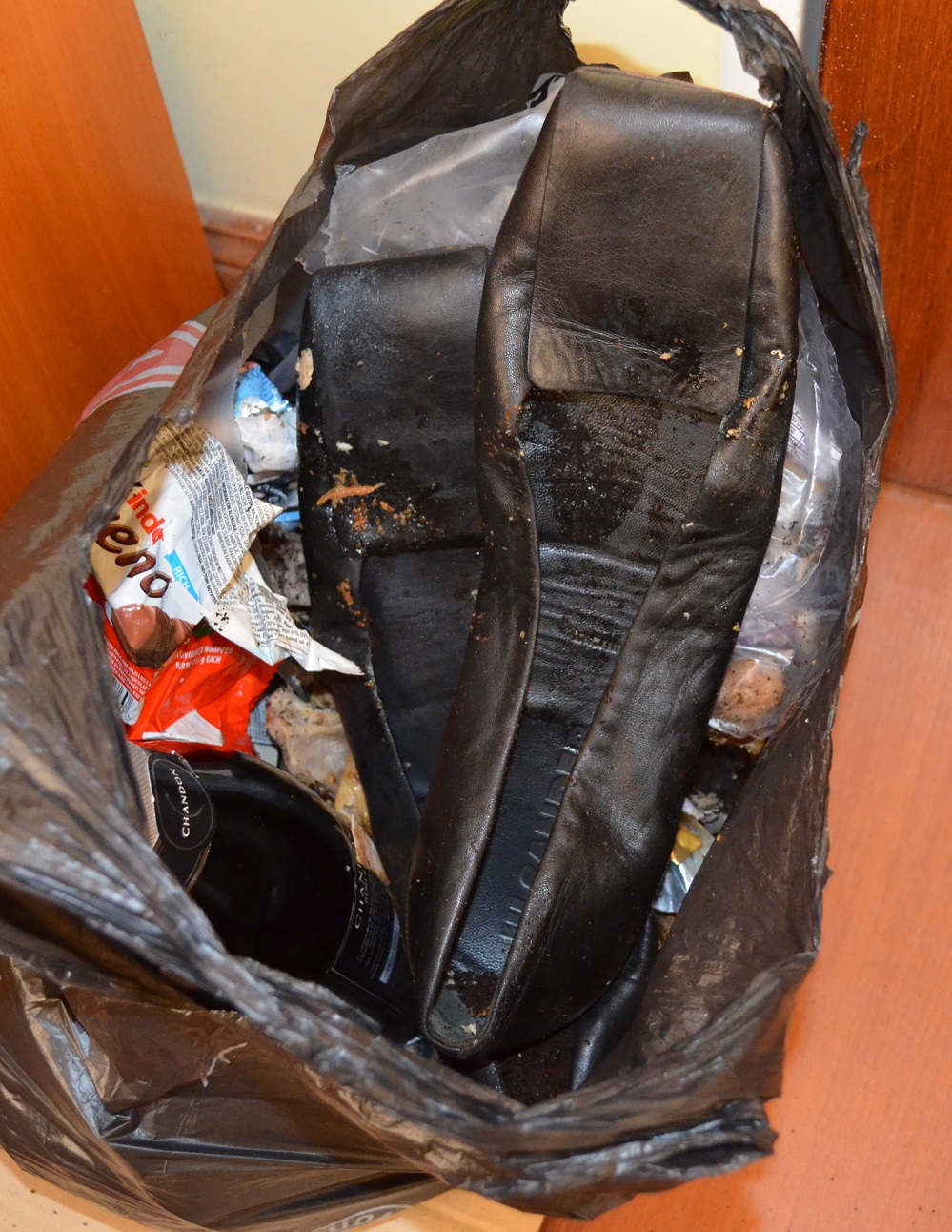 Nur einen Tag durften die feinen Schuhe so unbefleckt im Müll ruhen, dann gab es Hühnchen zum Abendessen - und die Reste landeten natürlich auch im Müll. Die fettigen Abfälle schmiegten sich an das zarte Leder. Ich will mir nicht vorstellen wie sich die zersplitterten Hühnerknochen sich dann im Müllauto in das weiche Leder drücken . . .