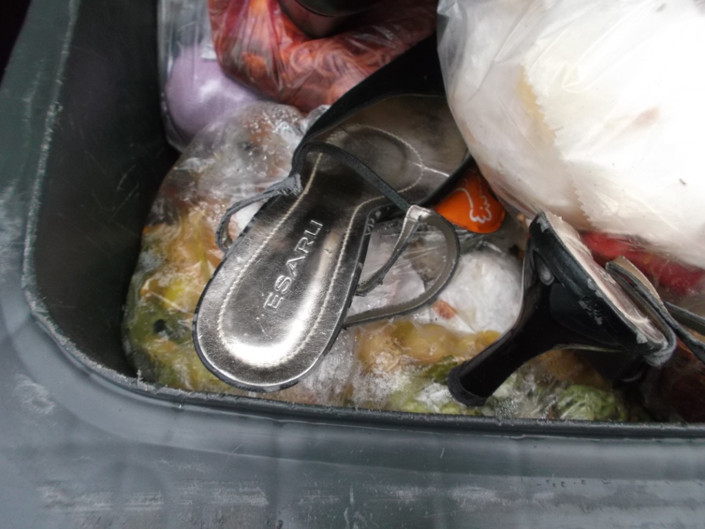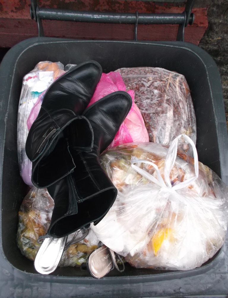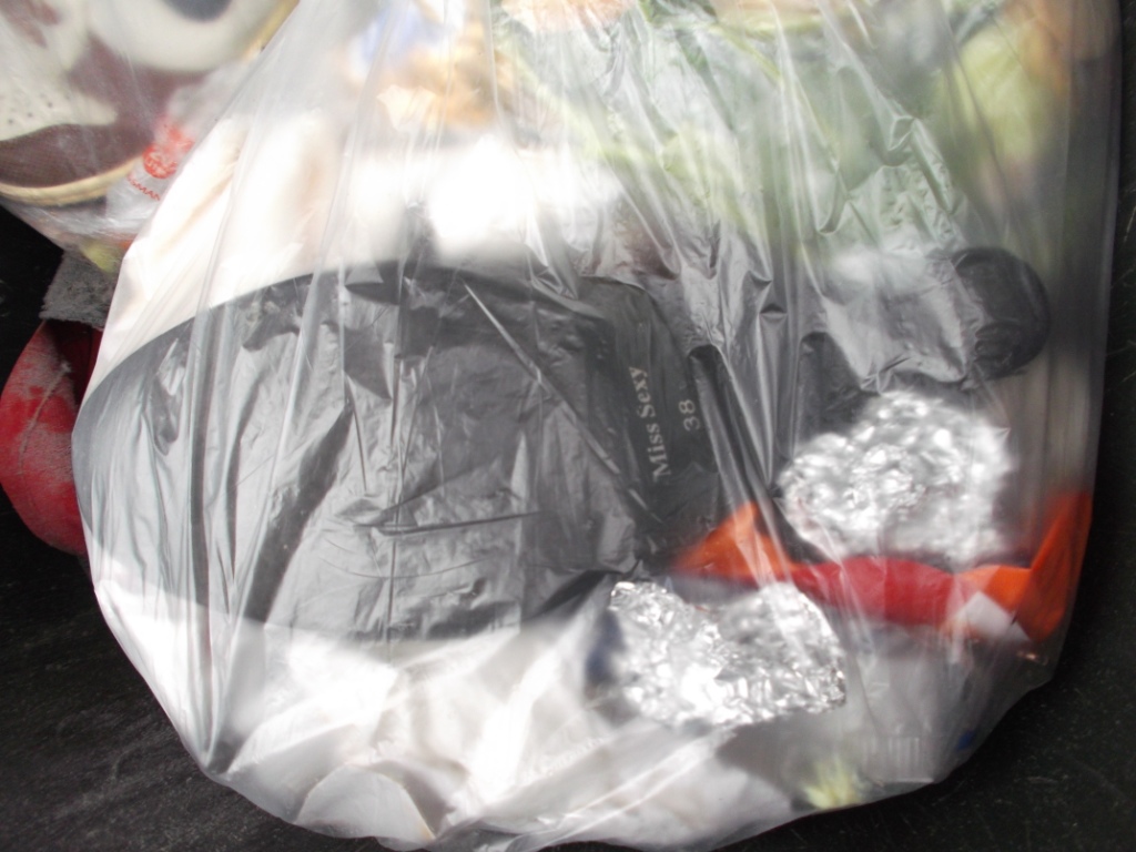 In der einen Hand hing ein Küchenmüllbeutel und zwischen ihren Fingern baumelten zusätzlich noch ihre sexy Slingpumps, die sie immer zu festlichen Gelegenheiten getragen hat. In der anderen Hand hatte sie ihre viel zu oft getragenen Echtleder-Stiefeletten, welche man ru recht als "natürlich vernichtet" bezeichnen konnte.