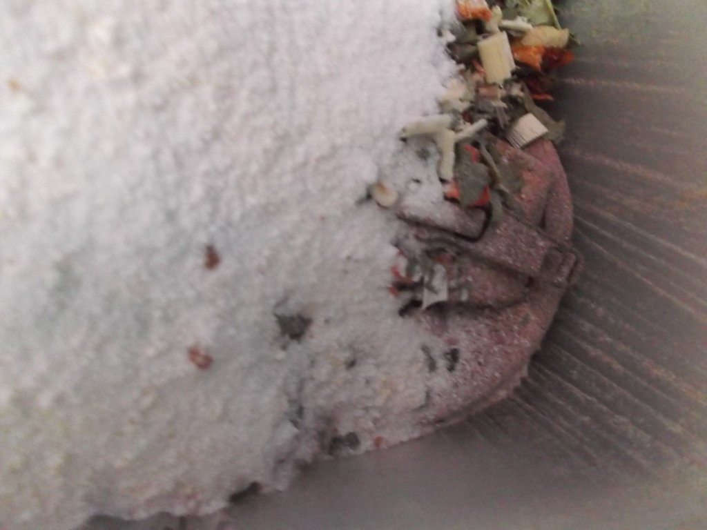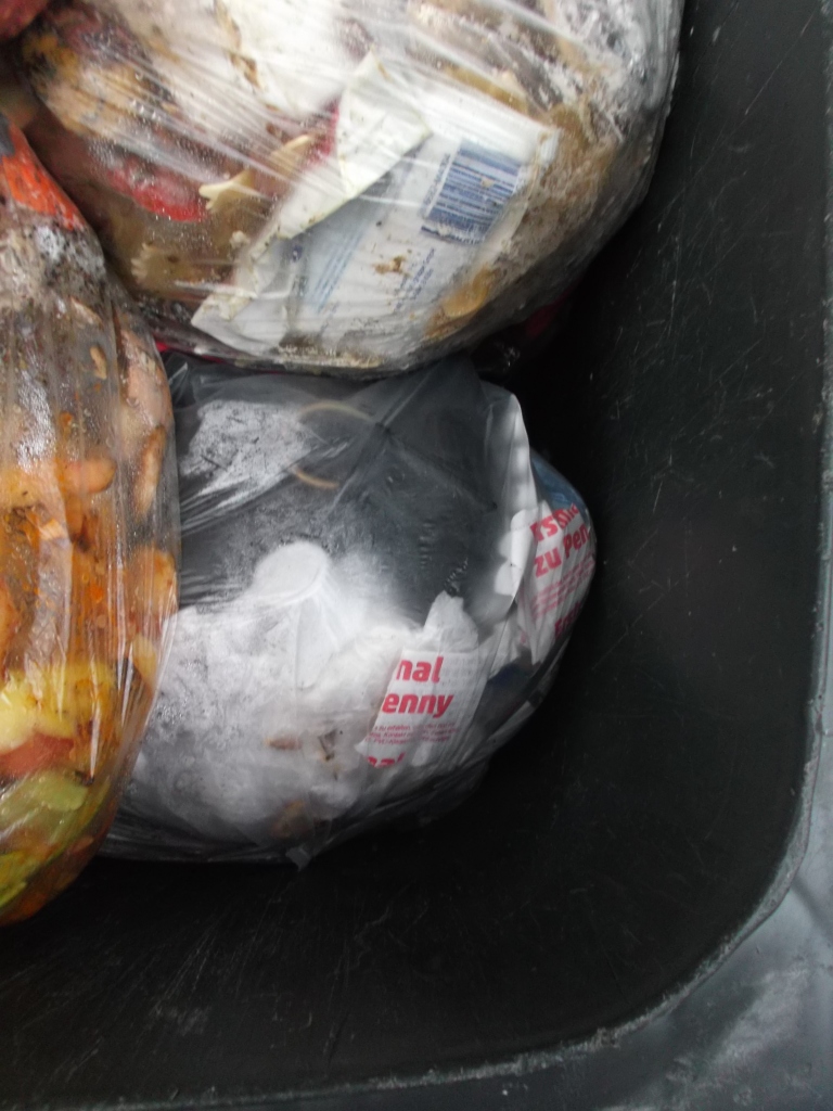 Nachdem noch irgendwelche Frühstücksflocken in den Küchenmüllbeutel gekippt worden waren, kam auch dieser prall volle und "gut gewürzte" Küchenmüllbeutel in unsere Tonne.