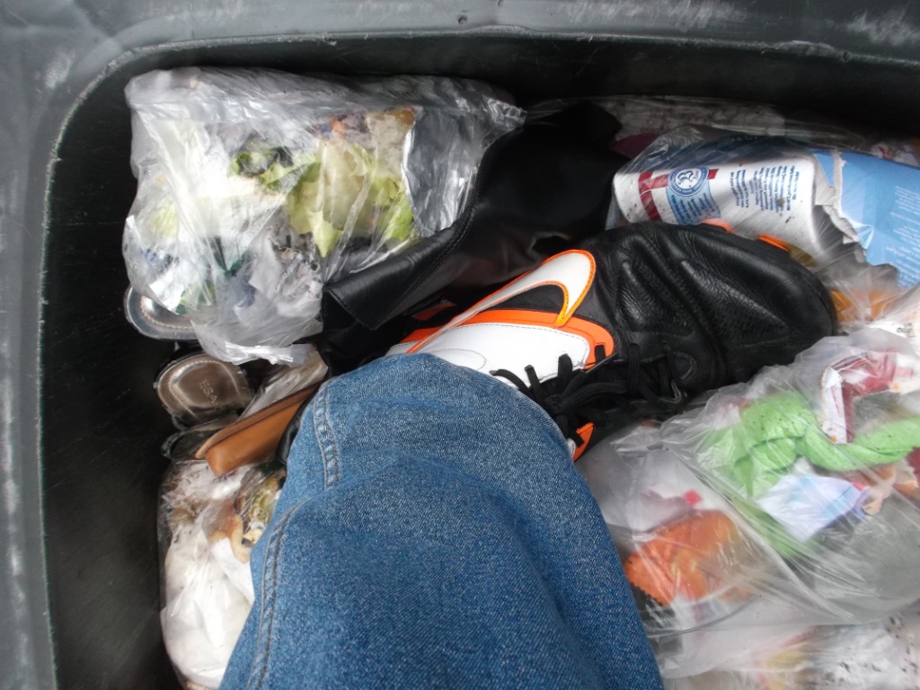 Gerne nehme ich zum Müll einstampfen alte Fußball-Stollenschuhe, denn etwa wie der Müllverdichter mit seinen Zähnen auf der Deponie, können sich Fußballschuhe besser "mit Grip" in den Müll und glitschigen Siff "bohren".