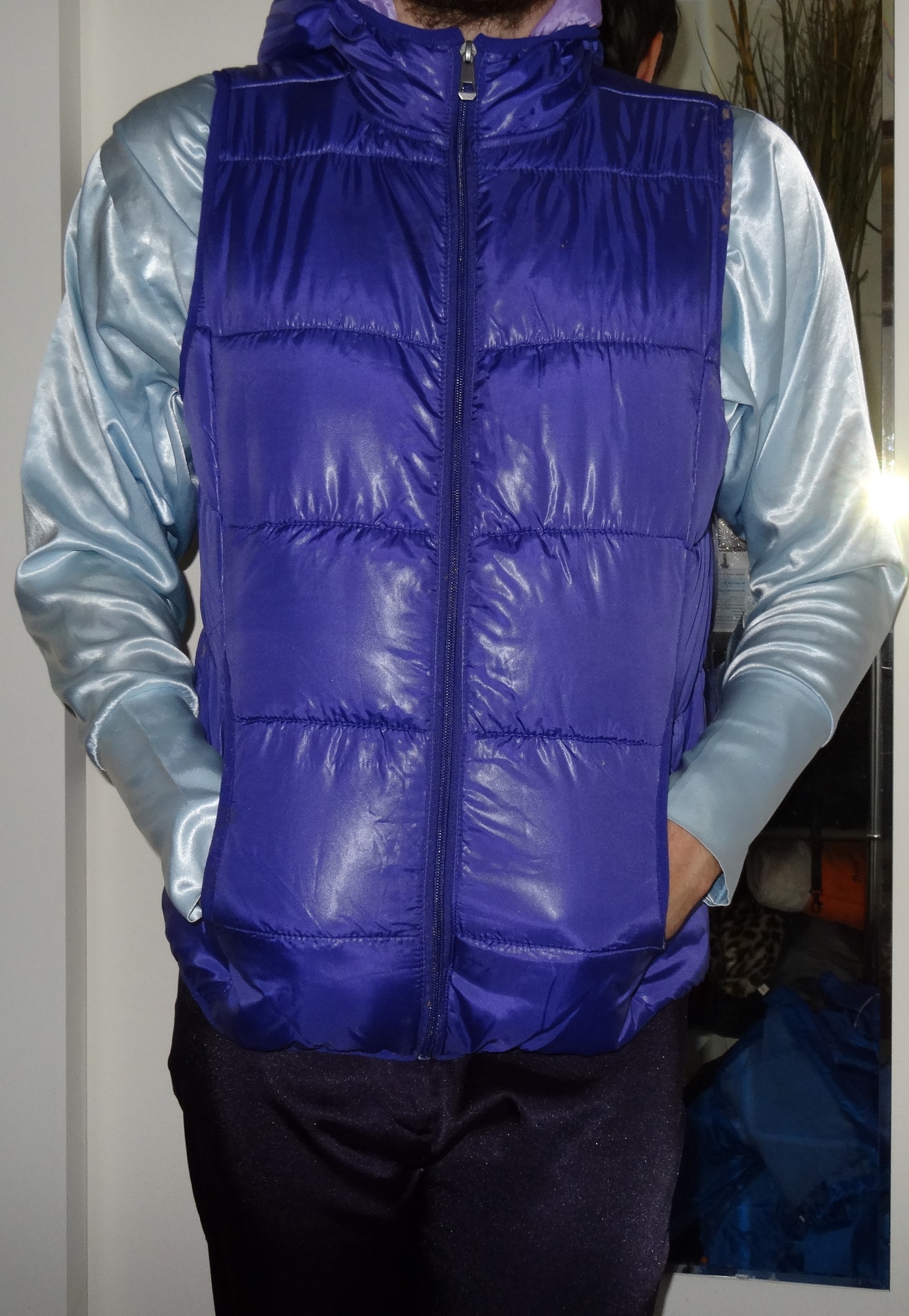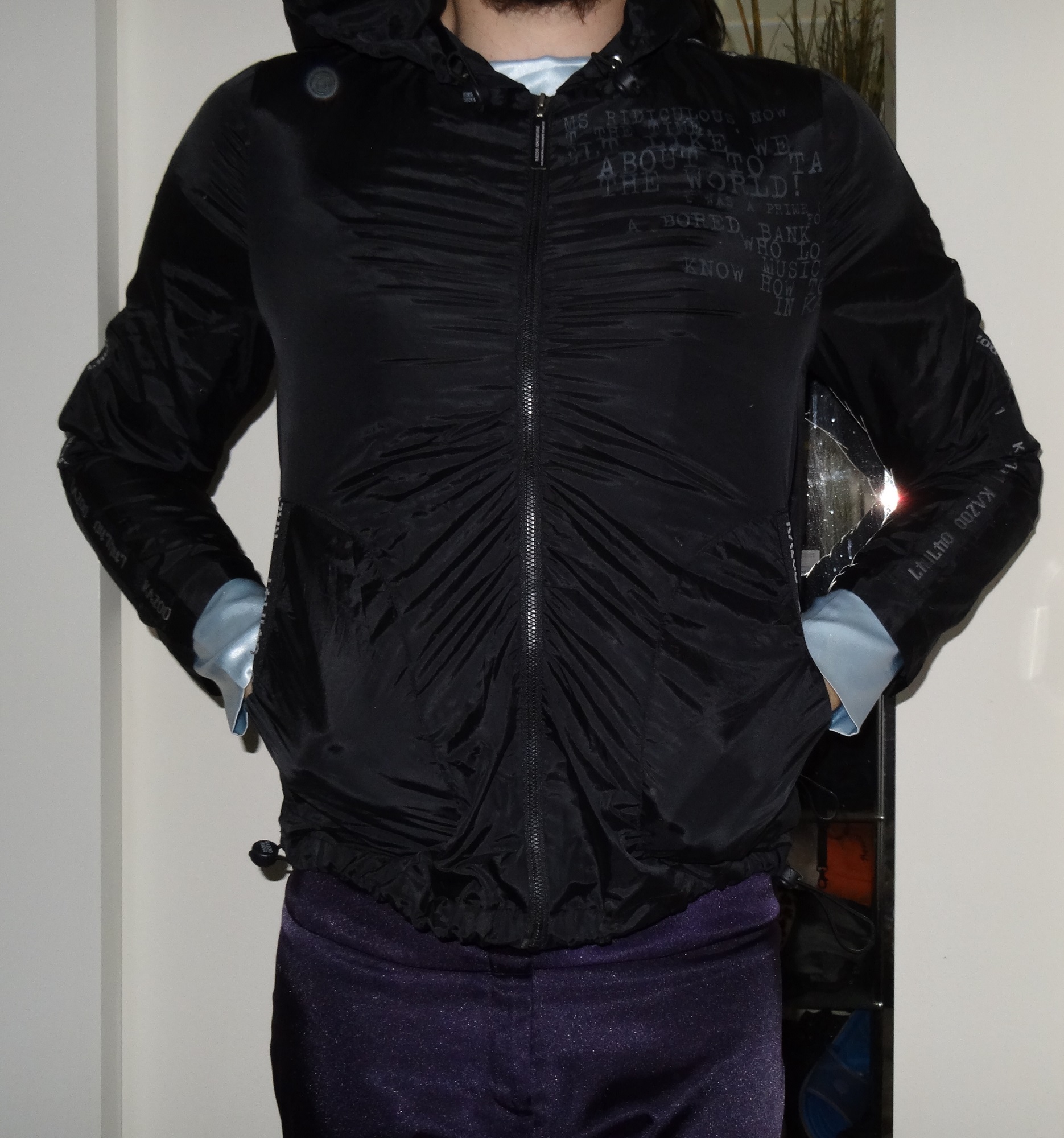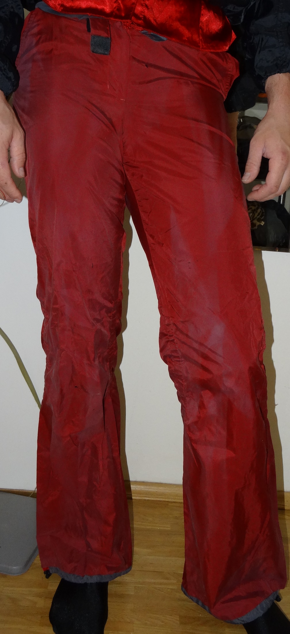 Ich hab im meine alte Nylonhose wiedergefunden, leider passt sie mir nicht mehr. die war mal wasserdicht, jetzt wird's nass in der Hose, das Shirt ist noch ein Überbleibsel meiner Ex, das muste jetzt einfach weg.