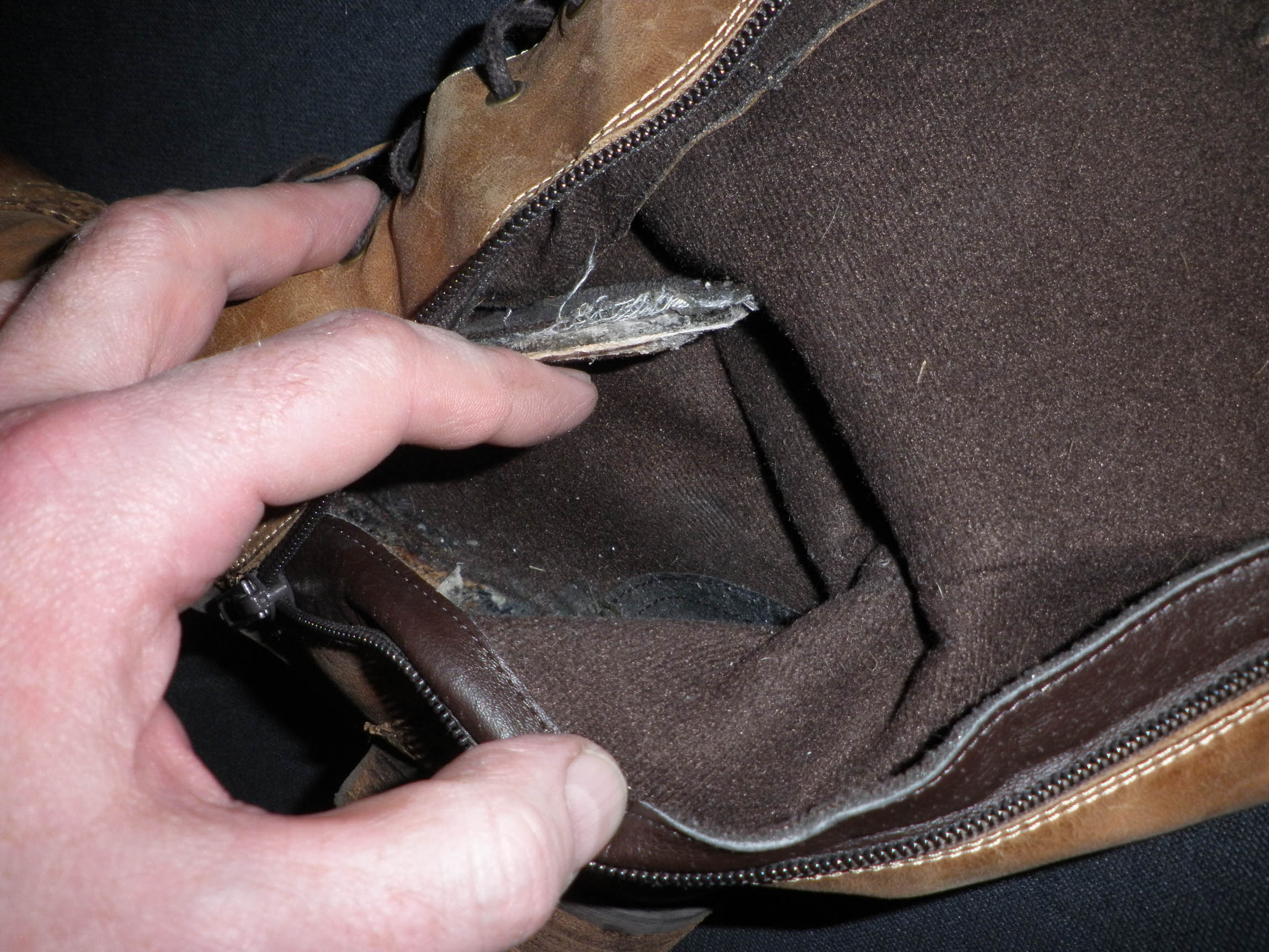 Nachdem ich die Stiefel gestern ausgiebig getragen habe, hatte ich beim Ausziehen des rechten Stiefels irgendwie ein komisches Gefühl. Ich habe mir den Stiefel dann mal genau angesehen und festgestellt, dass die komplette Innensohle, also mit Verstärkung und Metallsteg, sich von der Sohle gelöst hatte. Zu meiner Freude sind die Stiefel aber weiterhin tragbar.