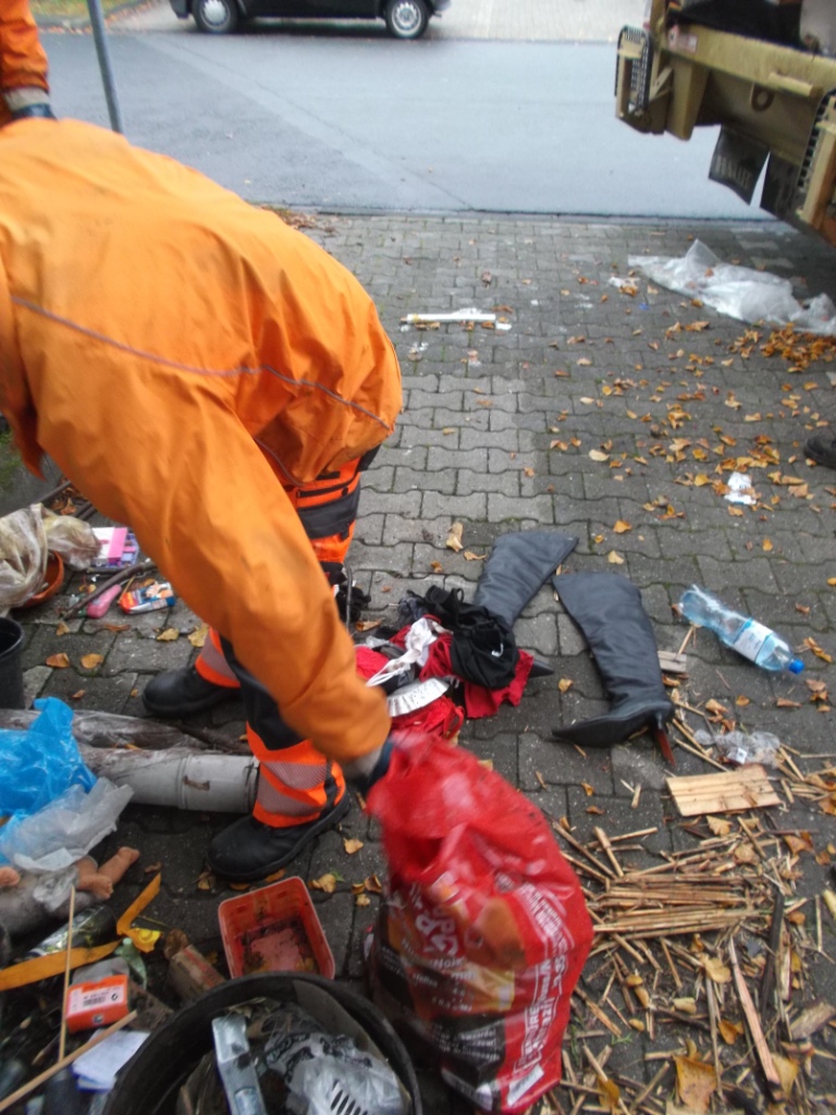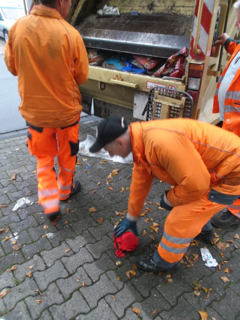 Die "Begeisterung" der Müllmänner hält sich in Grenzen, sich wg. solch einem Dreck bücken zu müssen und dann gibt's auch keine Rücksicht mehr auf zarte Spitzenwäsche. Die latschen mit ihren dreckigen derben Arbeitsschuhen einfach drüber.