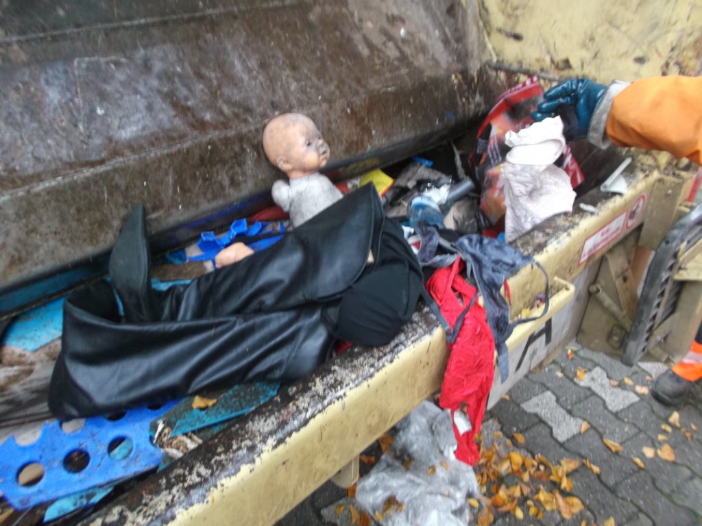 Ein Witz: Das Puppengesicht wurde durch den Pressdruck gegen die BHs gedrückt und mit Wange und Nase zog das Puppengesicht die sündige Wäsche mit in die Müllschüttung.