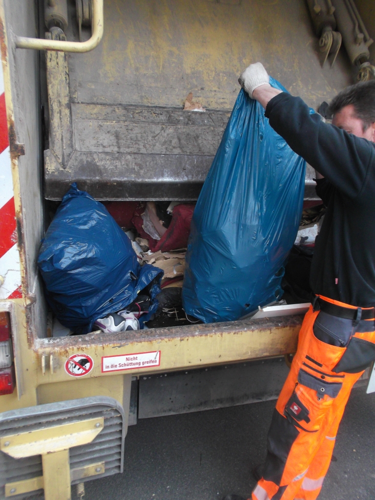 O-Ton Müllfahrer: "Ei, die Tittenheber wollen wohl nicht, aber wartet, beim nächsten Durchgang geht ihr mit!"