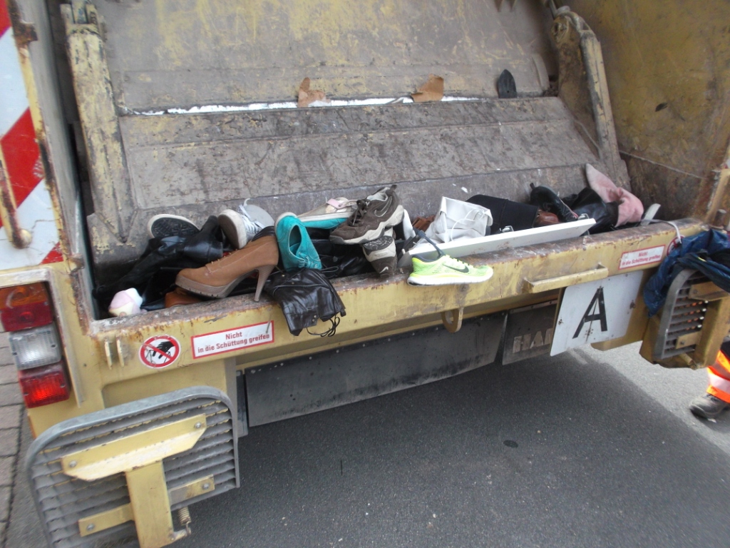 Alle Müllsäcke lagen nun nur Erleichterung der "Mama" im Pressmüllauto und einige Schuhe kullerten "ins Freie".