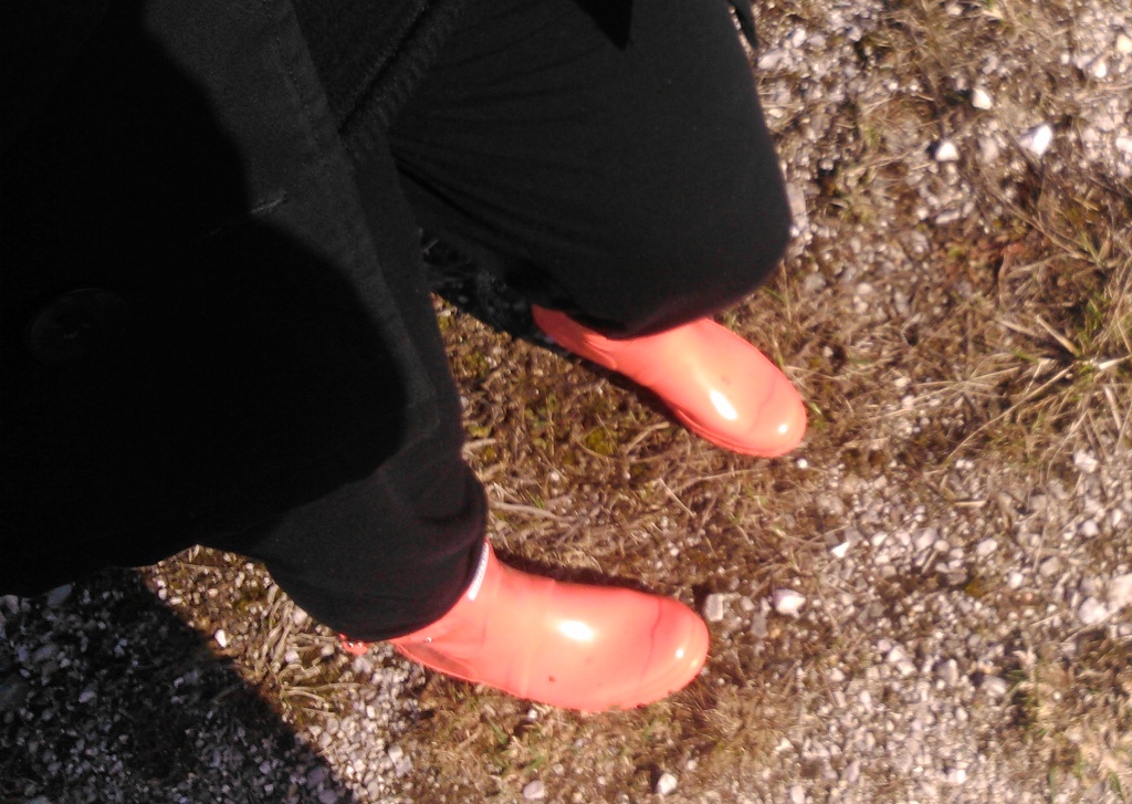 Frauchen hat neue Gummistiefel bekommen Hunter short gloss in hellorange und sie trägt sie gerne zum spazierenlaufen - hier die ersten Bilder