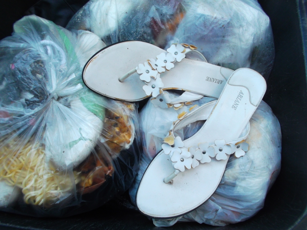 - Süße weiße Sandalettchen in unserer recht sauberen Restmülltonne.