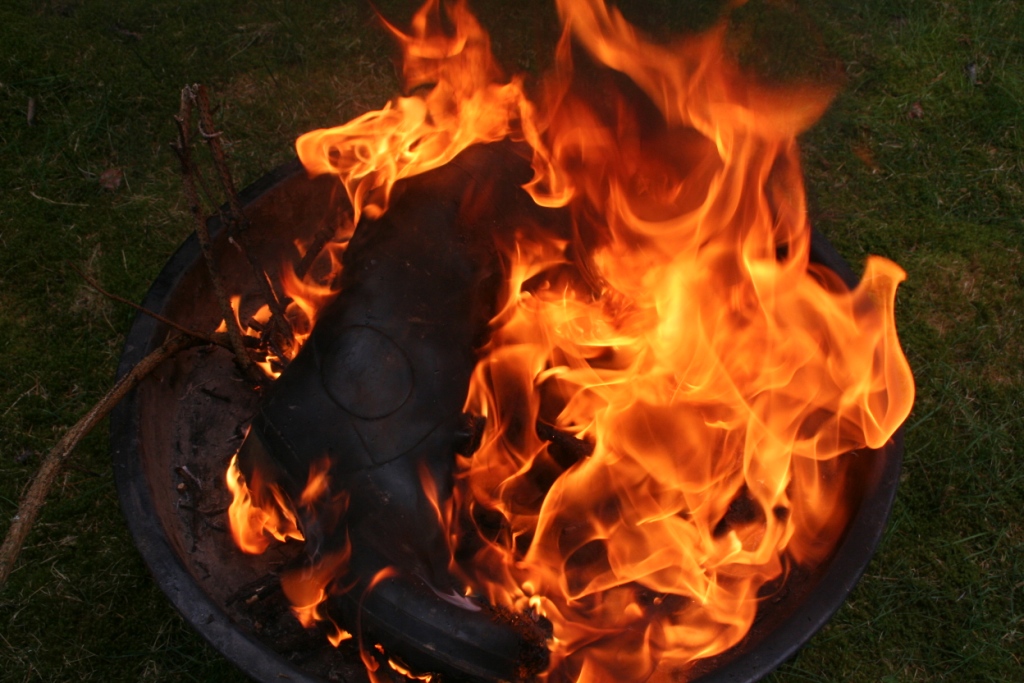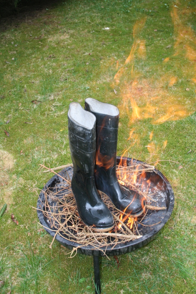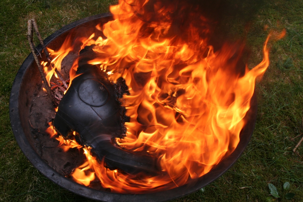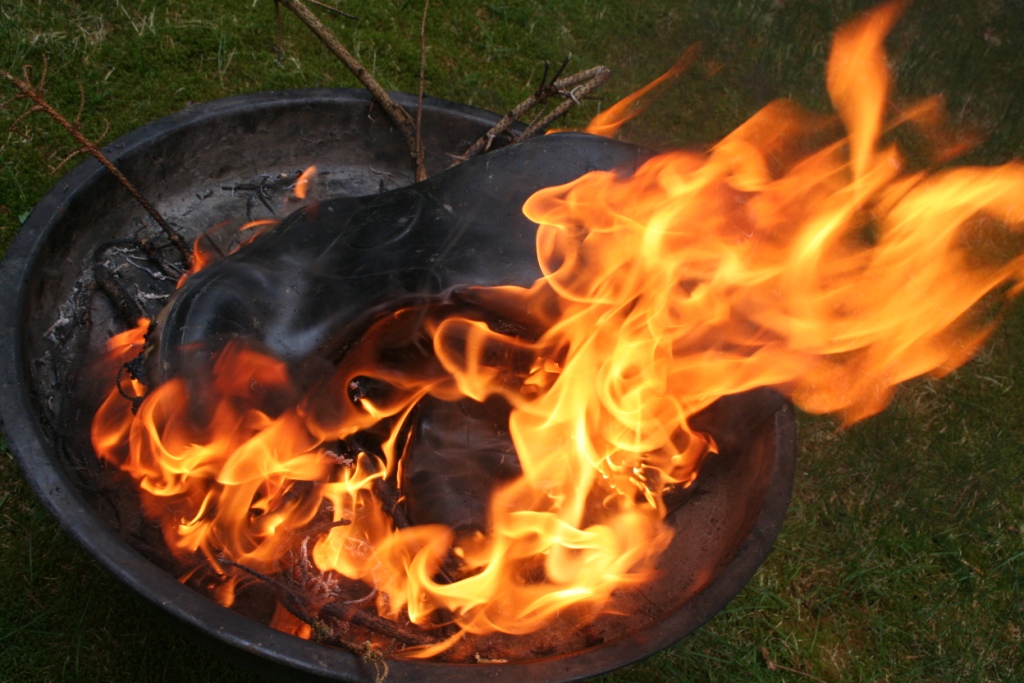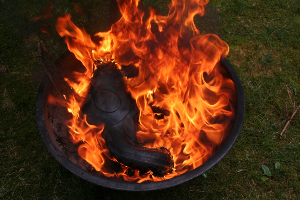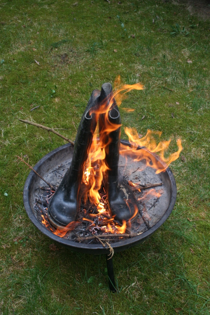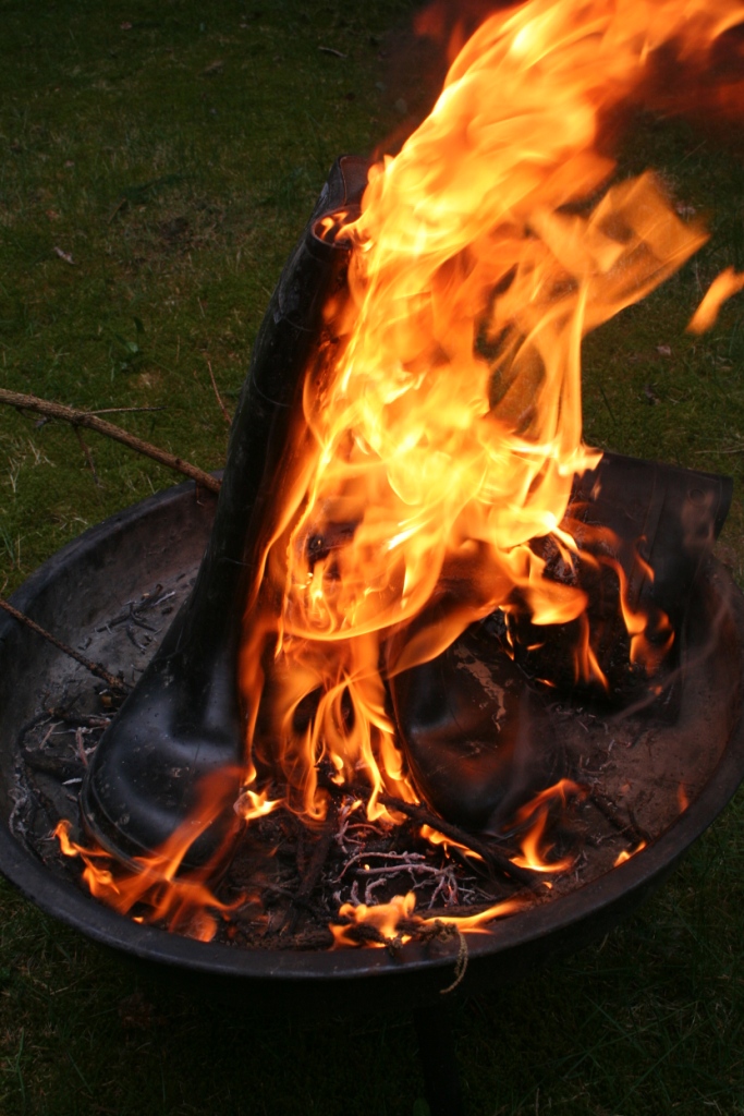 Gummistiefel brennen besonders gut, wenn sie aus Gummi sind. ( Es gibt ja auch welche aus PVC ) Trotzdem ist es ratsam, ein kleines Holzfeuer anzuzünden, bevor sie daraufgestellt und gegrillt werden. DIe Rauchentwicklung ist dann geringer und es geht auch schneller. Ein wenig flüssiger Grillanzünder verhilft ihnen am Anfang sogar noch mal zu etwas Glanz. Nach dem anzünden umzüngeln erste Flammen die Stiefel um sich gleich darauf in das Gummi zu vertiefen. Bald knickt der Schaft ein, ein Stiefel sinkt auf den anderen, das Gummi wirft Blasen, der typische Geruch brennenden Gummis liegt in der Luft, während die Flammen hell auflodern.