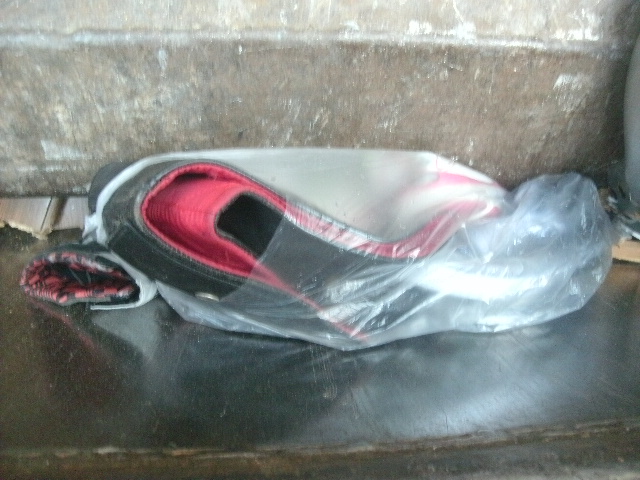 In einer Mülltüte einige Sneakers und eine lederne Bauchbinde, wie sie Biker tragen. daran geknotet ein Paar Puma-Stiefel und andere Pumas in ihren ausrangierten Helm praktischerweise gestopft. Nette Stiefel und verlatschte Uggs dazugestellt.