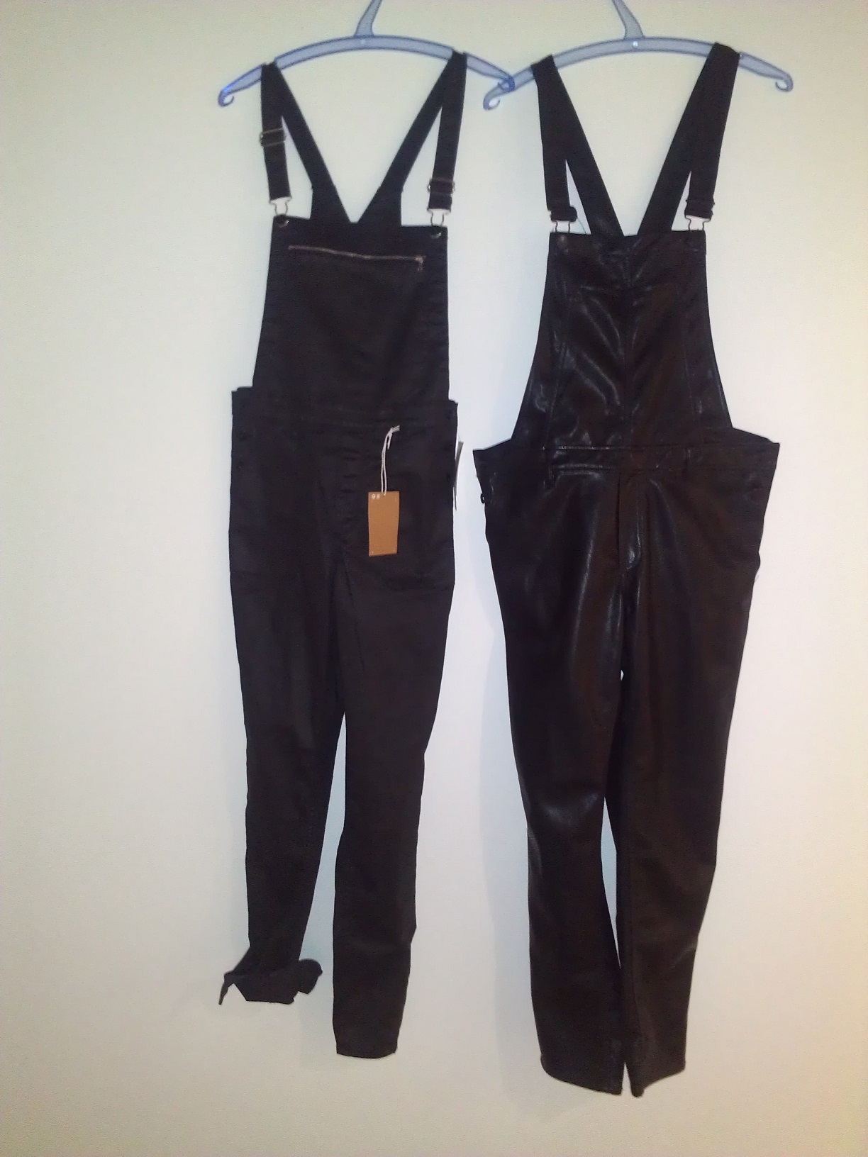 Die Linke ist aus einem matt beschichteten Stretch Stoff. Die rechte ist aus Kunstleder. Beide sind geschnitten wie Röhrenjeans, die Linke hat am Beinabschluss sogar Reissverschlüsse.