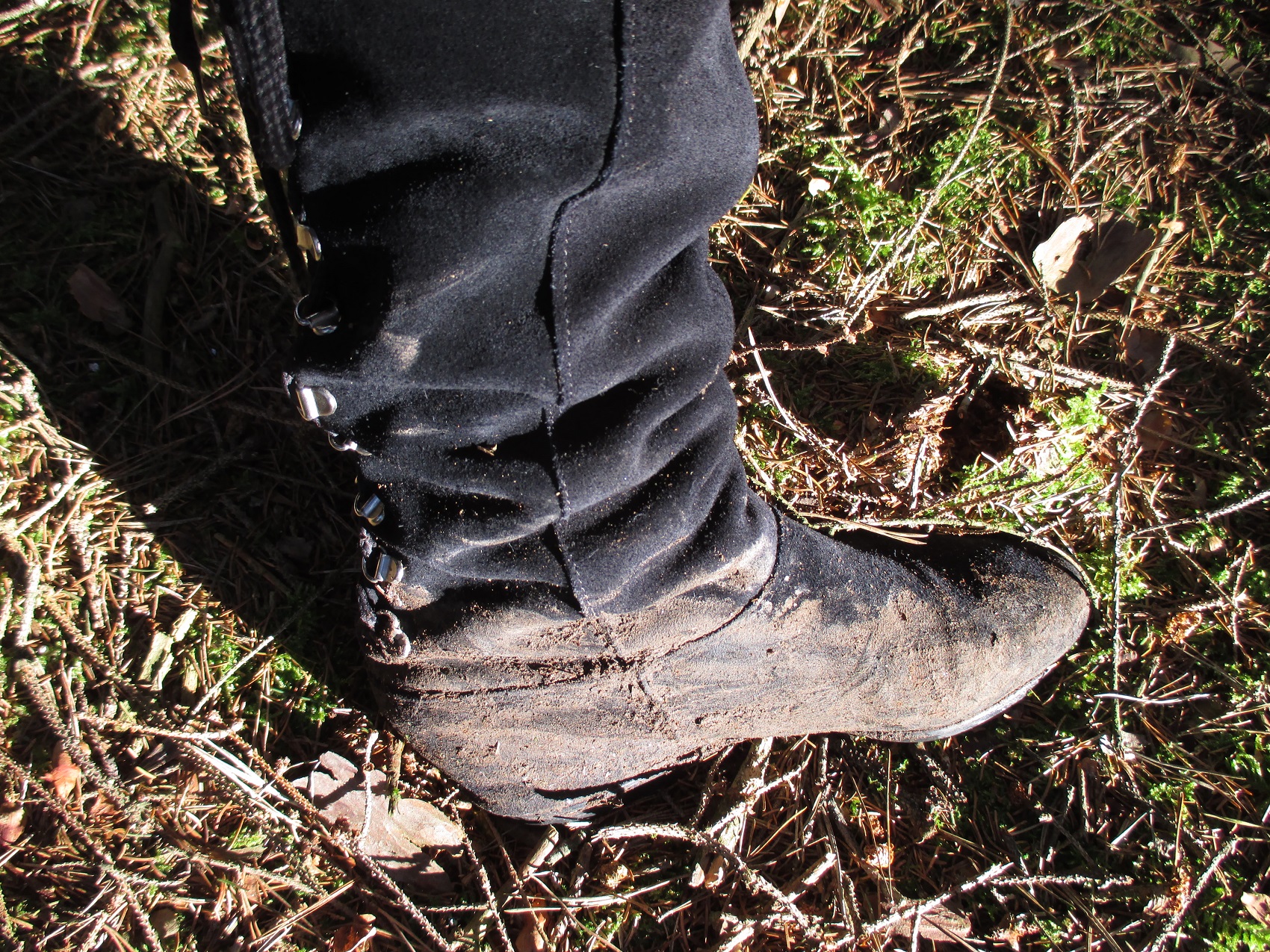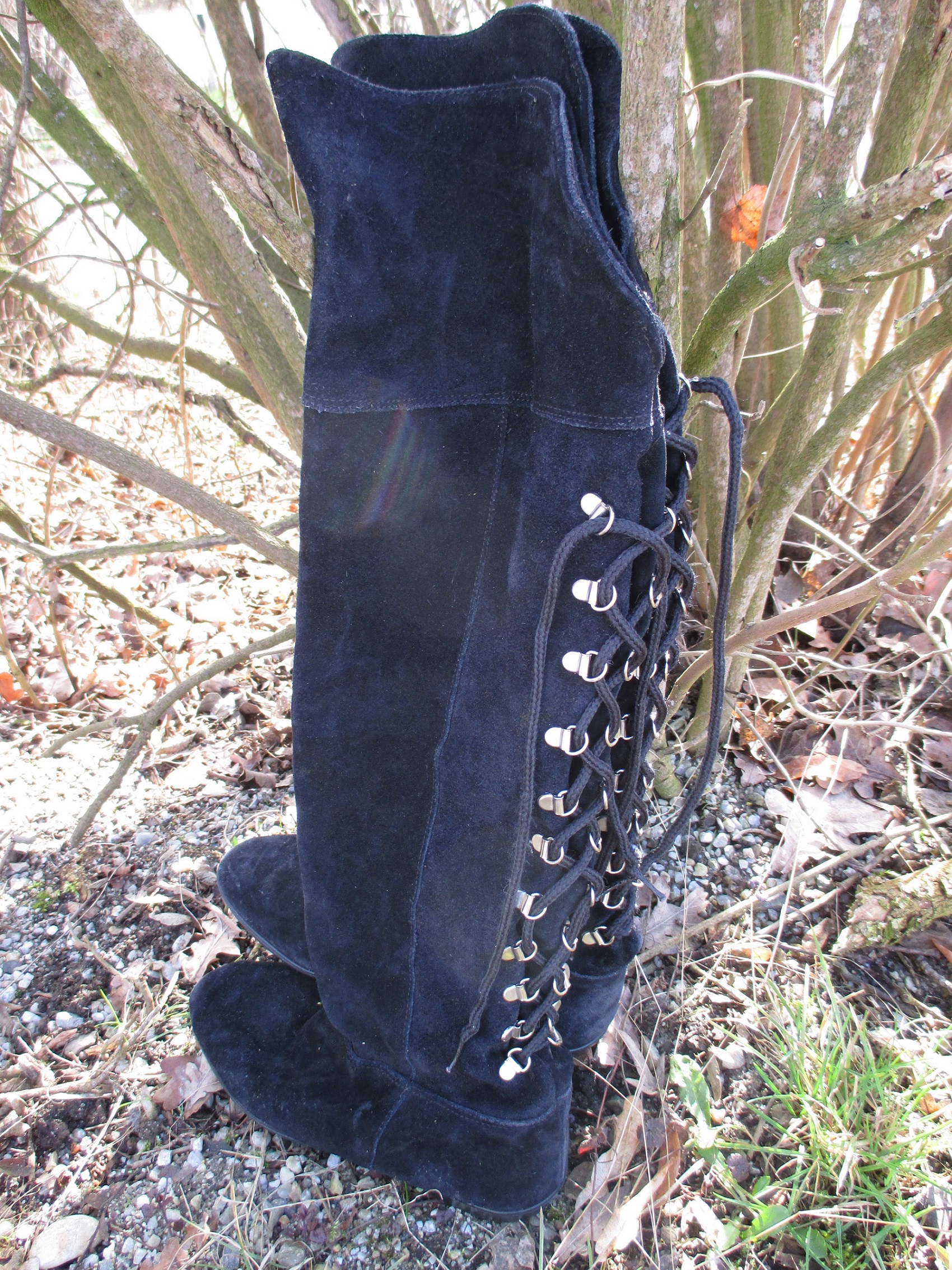Diese wunderschönen Overknee Stiefel aus Wildleder werden bald einem Streßtest in Schlamm und Wasser unterzogen werden. Bis jetzt sind sie noch sauber und gepflegt, was sich aber nach meinem ersten Waldspaziergang sichtlich ändern wird.