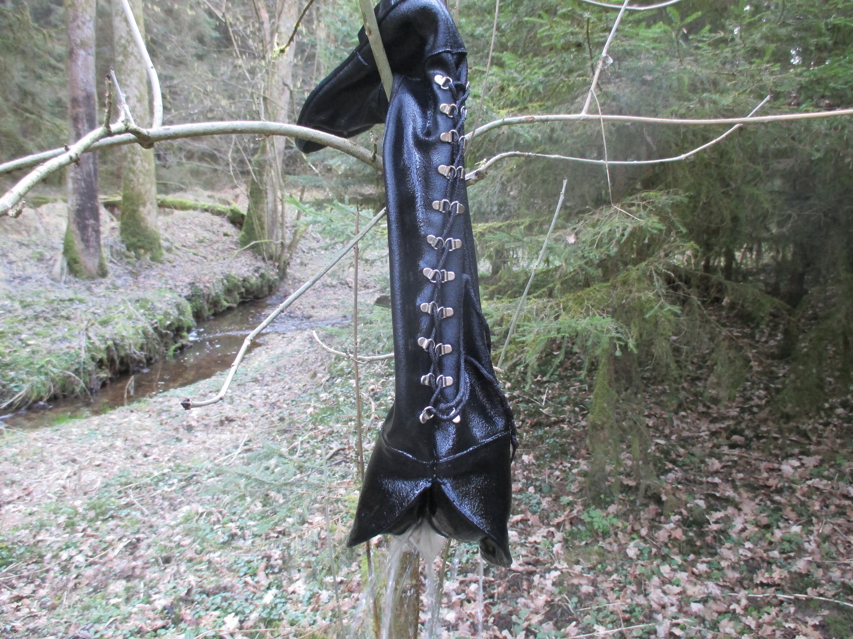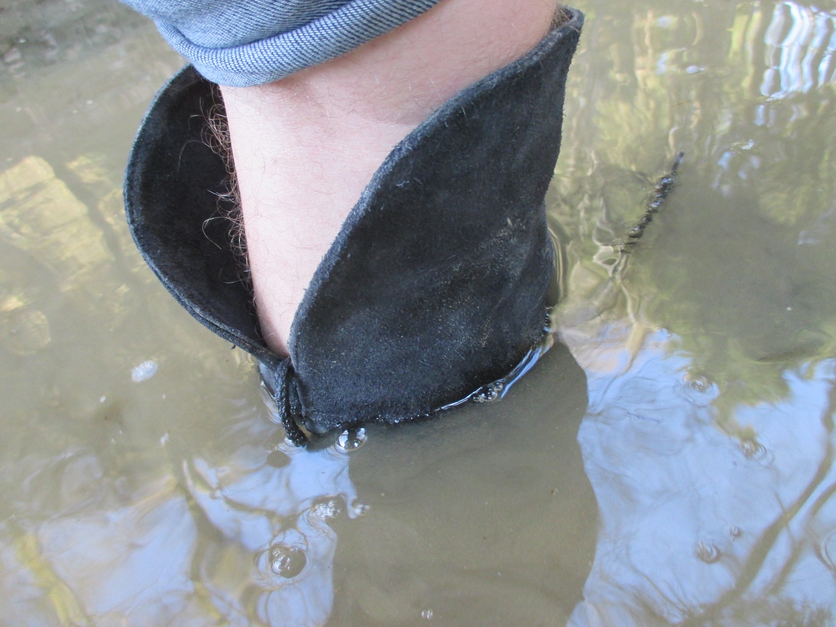 Der linke, noch intakte Stiefel wurde einer gründlichen Waschung unterzogen. Ich ging immer tiefer rein, so tief, bis es oben reinlief; geiles Gefühl, wenn das Wasser an den langen Stiefelseiten innen runterläuft .
