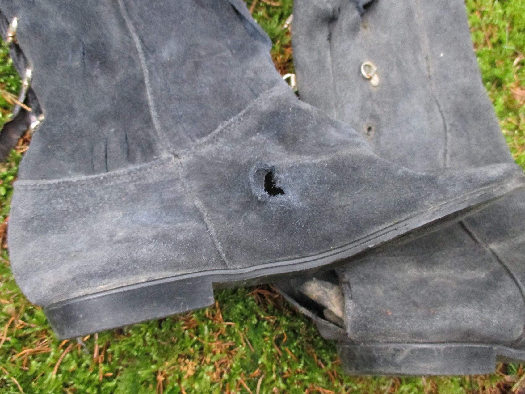 Allerdings ging bei dieser Aktion auch die Naht an der Ferse etwas auf. Macht ja nichts dacht ich mir. Die Stiefel sind sowieso dem Untergang geweiht. Als ich aber dann nochmals reinschlüpfte, wurde der Riss an der Ferse wesentlich größer, was mich aber nicht davon abhielt erneut mich in ein Schlammloch damit zu begeben, auch wenn somit die ganze Schlammsoße jetzt ungehindert in den rechten Stiefel floß.