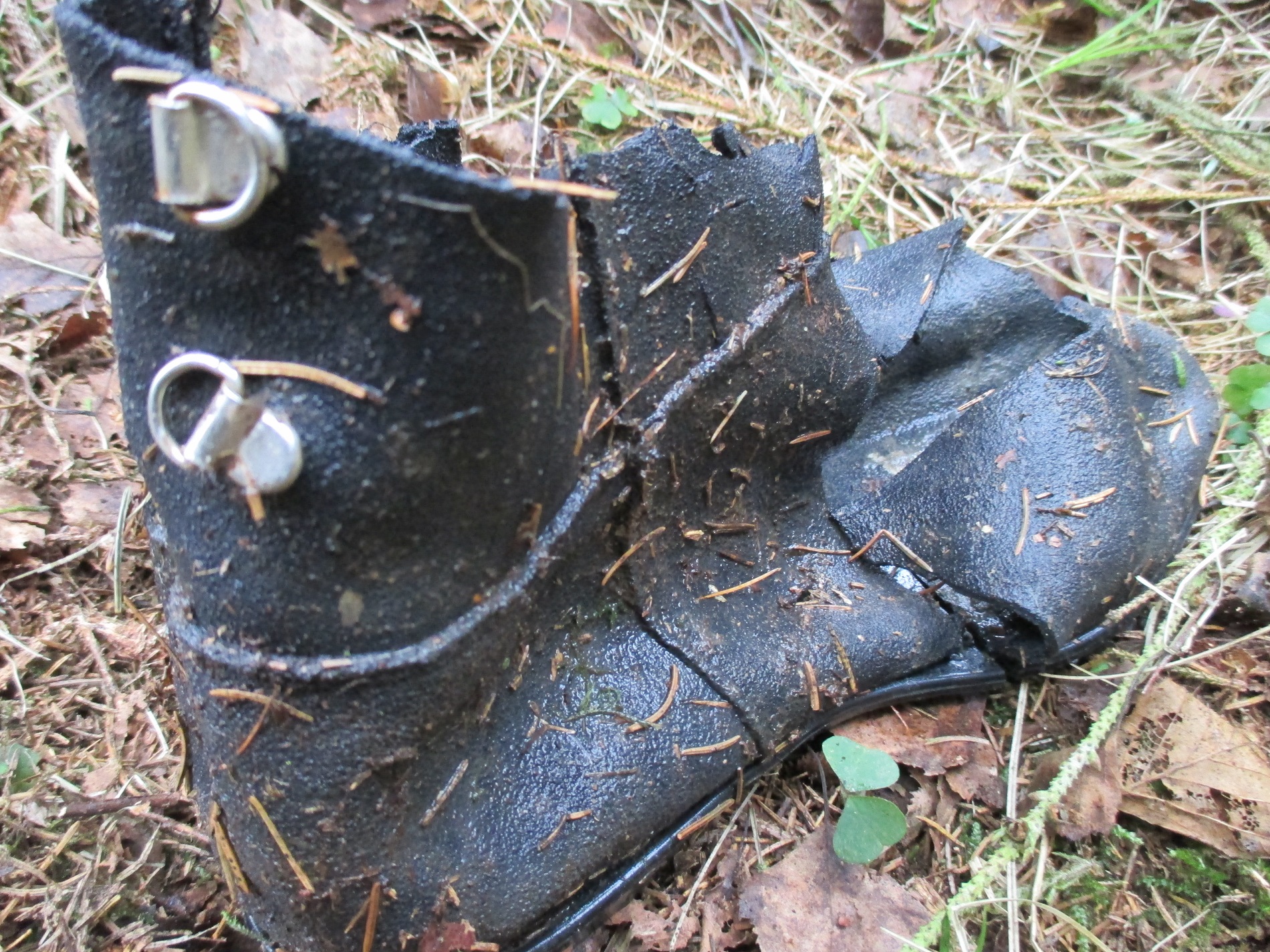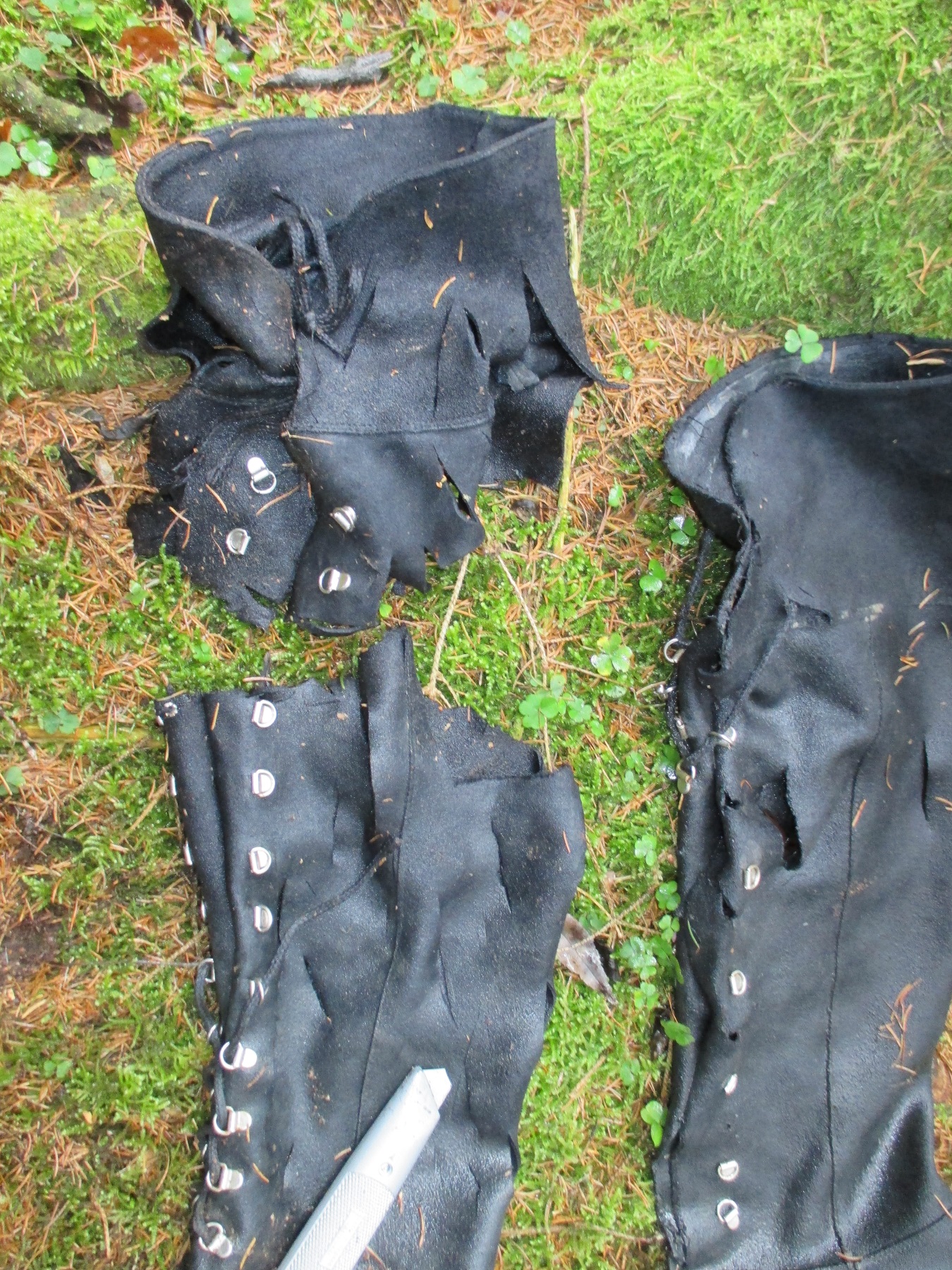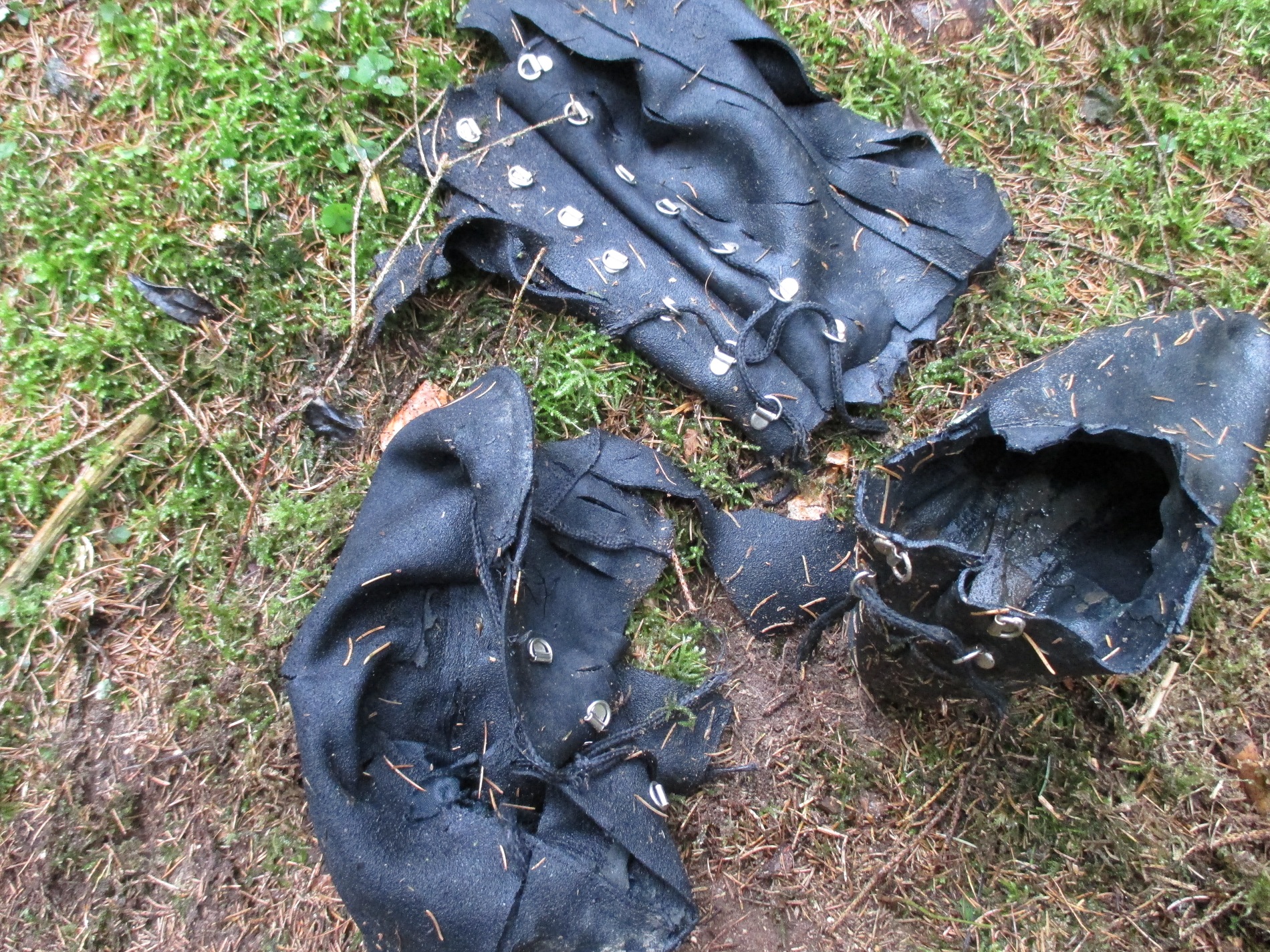 Nachdem sie wider trocken waren, hab ich sie auf dem heißen Asphalt fotografiert. Inzwischen ist die Naht am rechten Stiefel noch weiter aufgeplatzt, da ich die Nähte einer Belastungsprobe mit dem Wagenheber unterzogen habe. Und ich muß sagen, dass sie nicht sehr widerstandfähig waren. Aber was soll´s. Trotzdem ging es nochmal in den Wald hinaus, auch wenn der rechte Stiefel nur noch notdürftig am Fuß von den Schuhbändern gehalten wurde.