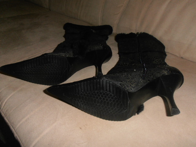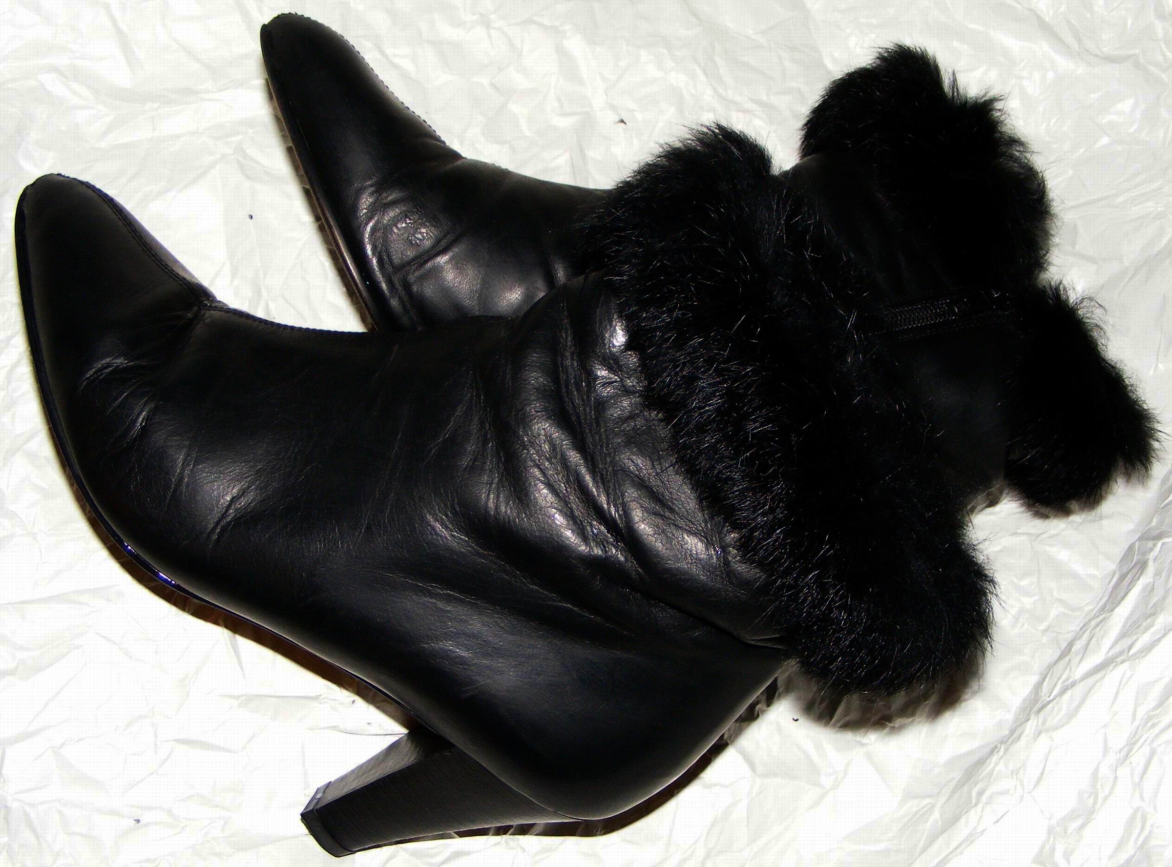 Einmal besuchte mich eine Kollegin, sie brachte alte Schuhe mit und wollte unbedingt mal zusehen, wie sie verbrennen. Wir gingen in den Keller, sie nahm ihre Schuhe aus dem Beutel und stellte sie vor den Ofen. Ich erschrak fürchterlich! Sie wollte doch glatt ein Paar echte Zara-Stiefeletten brennen sehen! (Leider gelangen mir auf die Schnelle nur diese beiden schlechten Fotos.) Ich mußte ja sofort handeln! Ich griff nach einem Paar auf dem Brennholz abgelagerten Stiefeln und konnte mit deren beispielhafter Verbrennung meine Kollegin zufrieden stellen. Die Temperatur des Kessels stieg auf das Maximum an und wir gingen wieder nach Oben. Während des Kaffeetrinkens hatte sie dann glücklicherweise ihre eigenen "Opfer" vergessen. Ich holte sie später aus dem Keller und arbeitete sie für mich auf. Und so präsentieren sie sich jetzt als "Mitglieder" meiner Sammlung! Für mich sind diese Zaras die schönsten und bequemsten Stiefeletten aller Zeiten! Eine Vernichtung, gleich welcher Art, käme niemals in Frage!