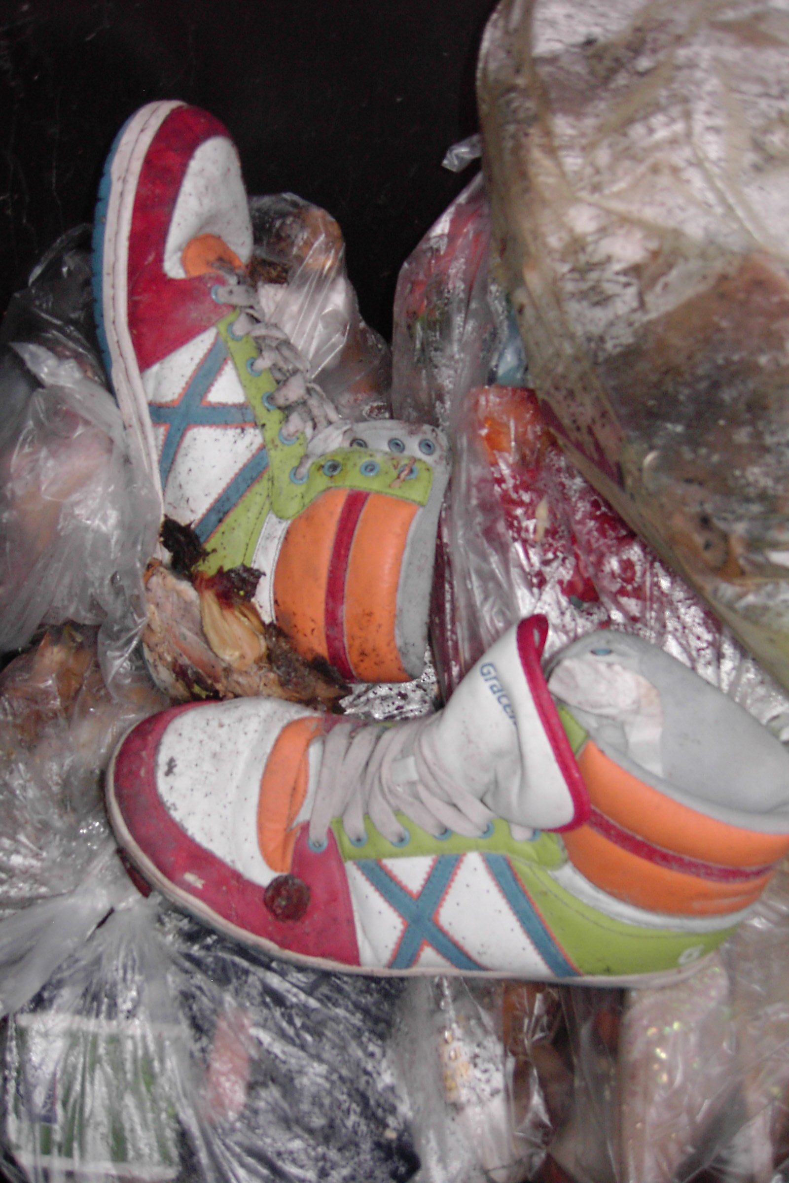 Gleich zwei Paar Pumps kamen zu Nudelresten und fauligem Obst in einen Müllbeutel.
