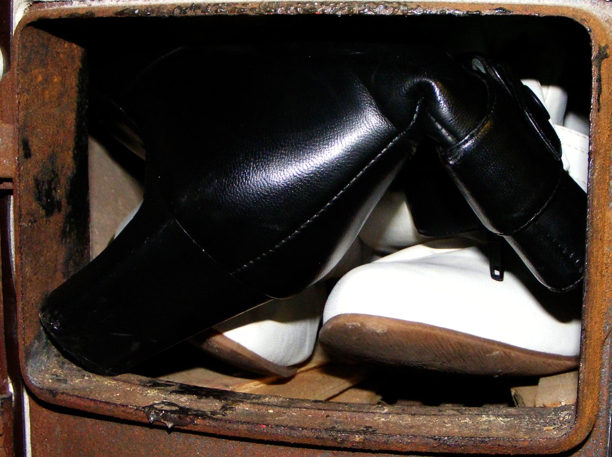 Bilder; alle hier gezeigten Schuhe/Stiefel befinden sich bereits in unmittelbar gefährlicher Nähe des Heizungsofens und warten sehnsüchtig auf ...